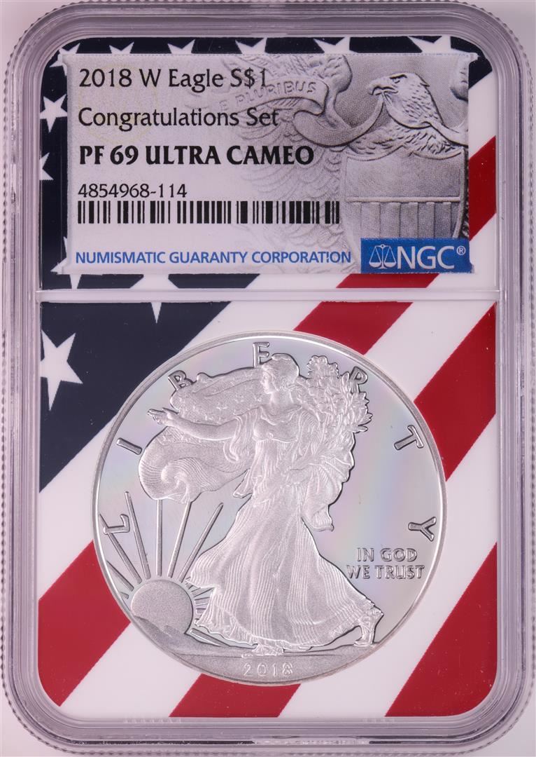 2018-W $1 Proof American Silver Eagle Coin NGC PF69 Ultra Cameo Congratulations Flag
