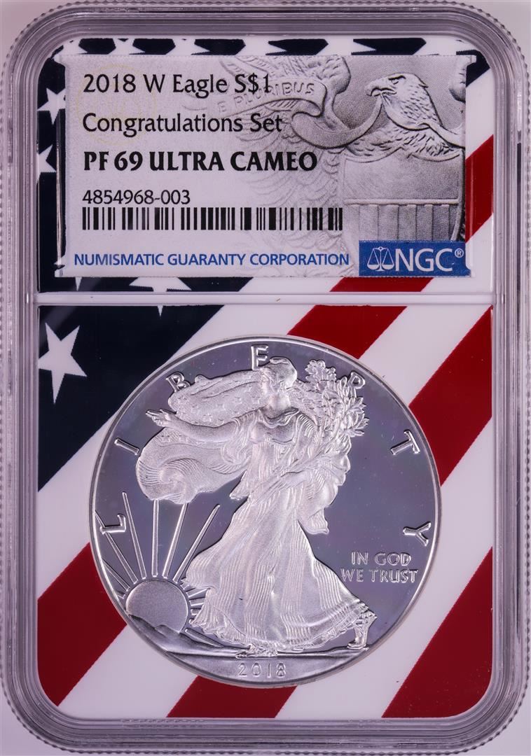 2018-W $1 Proof American Silver Eagle Coin NGC PF69 Ultra Cameo Congratulations Flag
