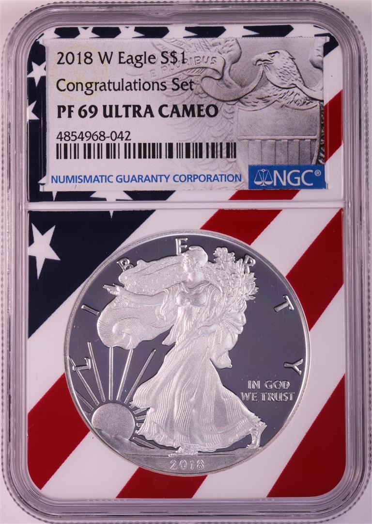 One 2018-W $1 Proof American Silver Eagle Coin NGC PF69 Ultra Cameo Congratulations Flag. NGC Certified.