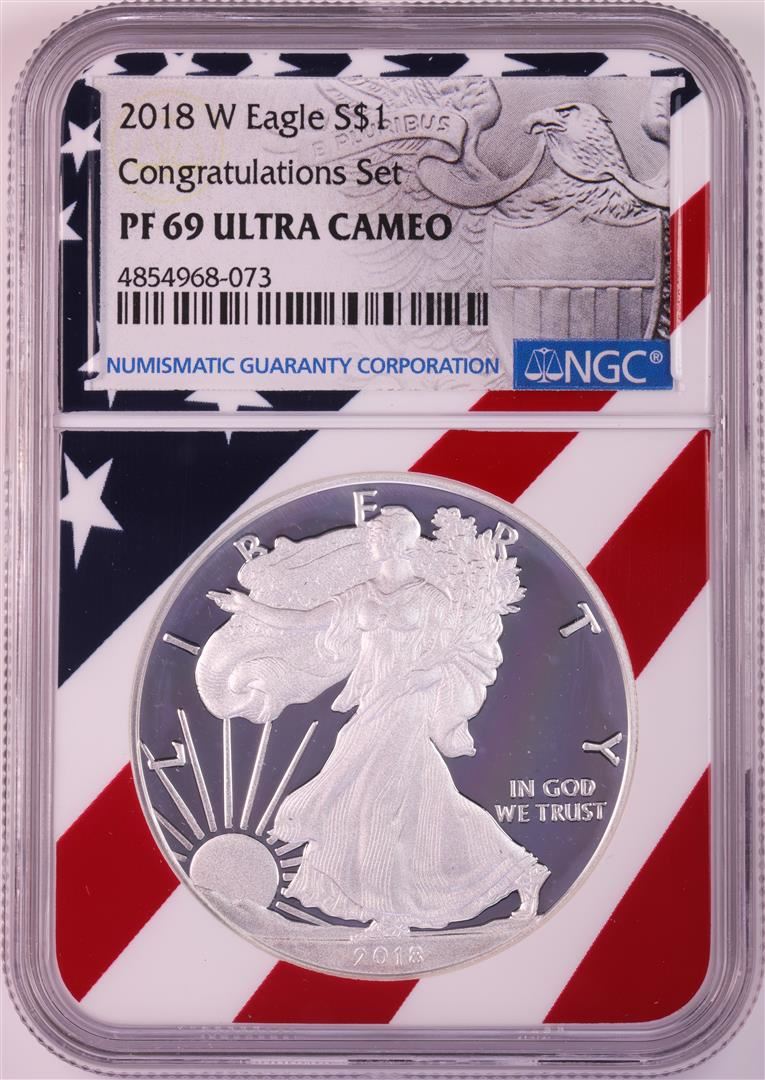 2018-W $1 Proof American Silver Eagle Coin NGC PF69 Ultra Cameo Congratulations Flag