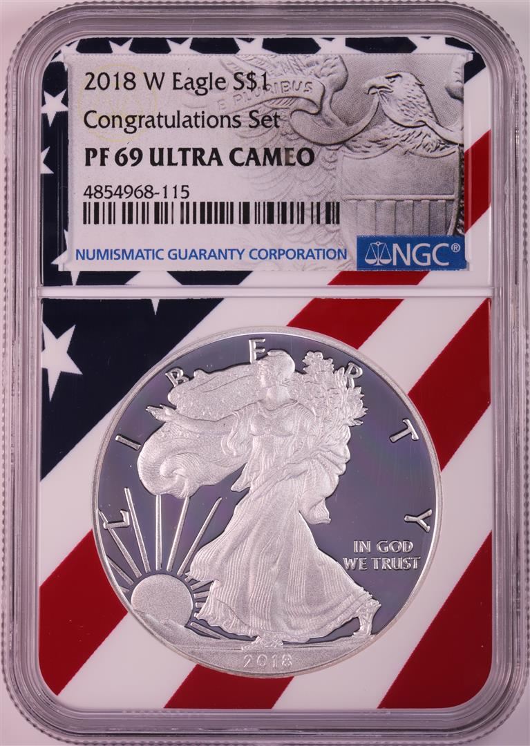 2018-W $1 Proof American Silver Eagle Coin NGC PF69 Ultra Cameo Congratulations Flag