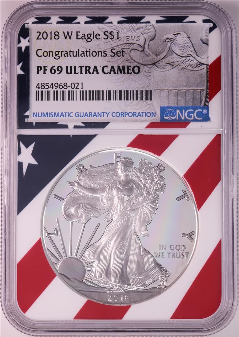2018-W $1 Proof American Silver Eagle Coin NGC PF69 Ultra Cameo Congratulations Flag