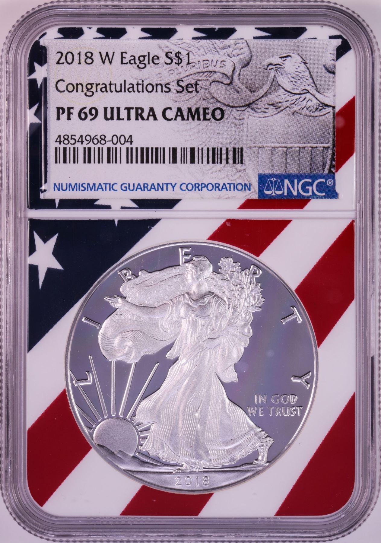 2018-W $1 Proof American Silver Eagle Coin NGC PF69 Ultra Cameo Congratulations Flag