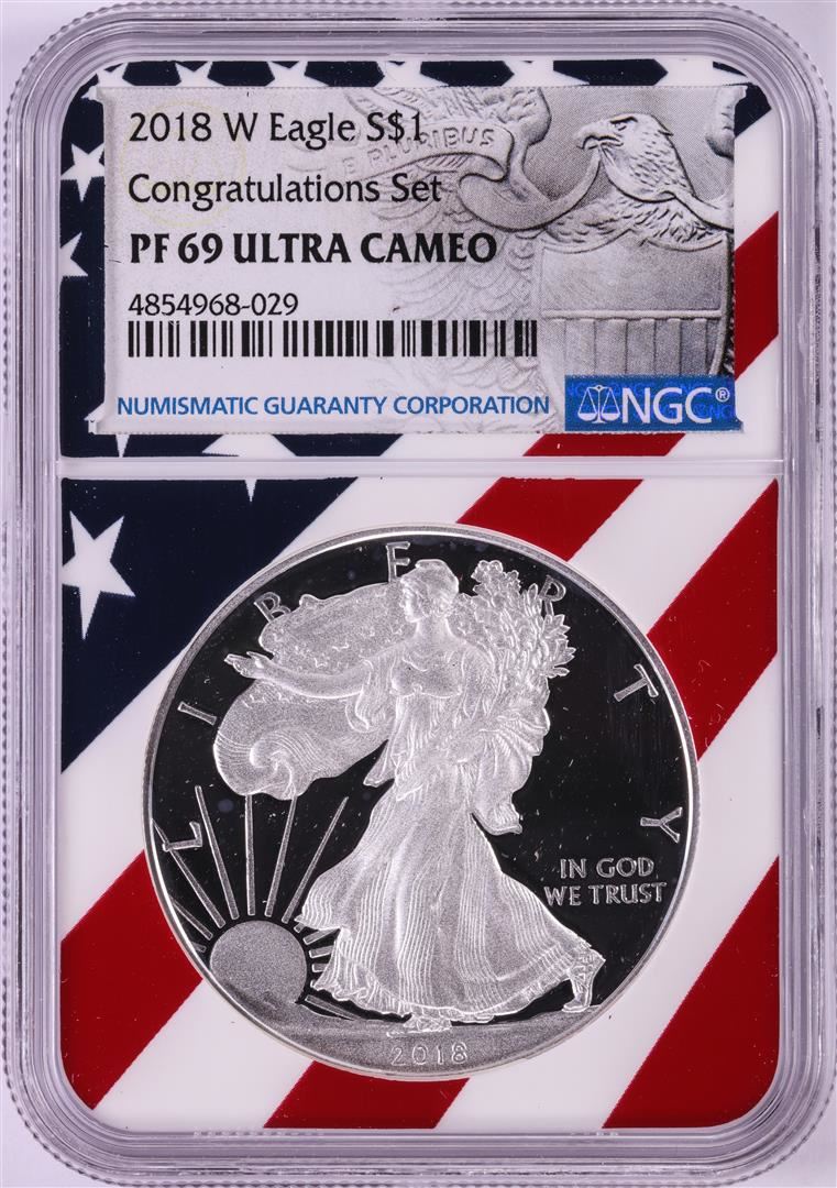 2018-W $1 Proof American Silver Eagle Coin NGC PF69 Ultra Cameo Congratulations Flag