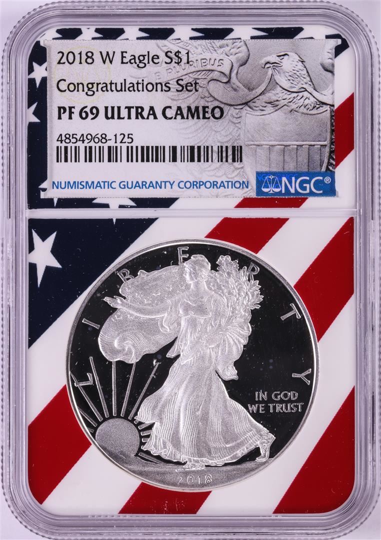 2018-W $1 Proof American Silver Eagle Coin NGC PF69 Ultra Cameo Congratulations Flag