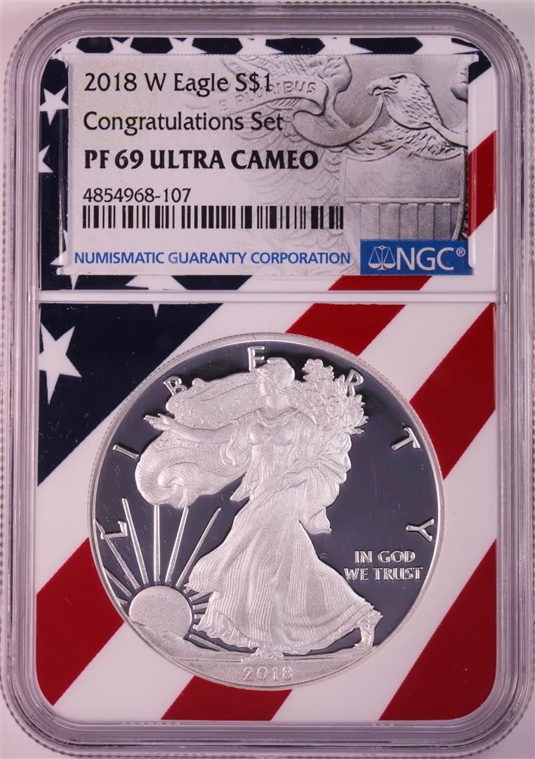 2018-W $1 Proof American Silver Eagle Coin NGC PF69 Ultra Cameo Congratulations Flag