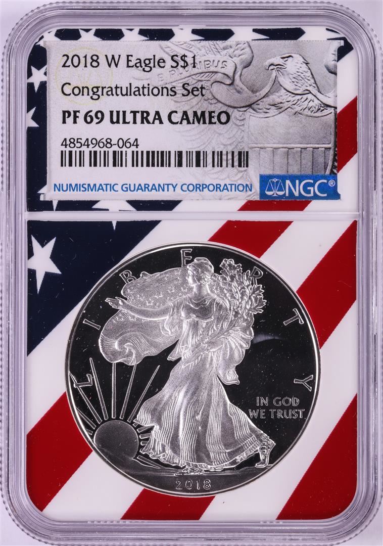 2018-W $1 Proof American Silver Eagle Coin NGC PF69 Ultra Cameo Congratulations Flag