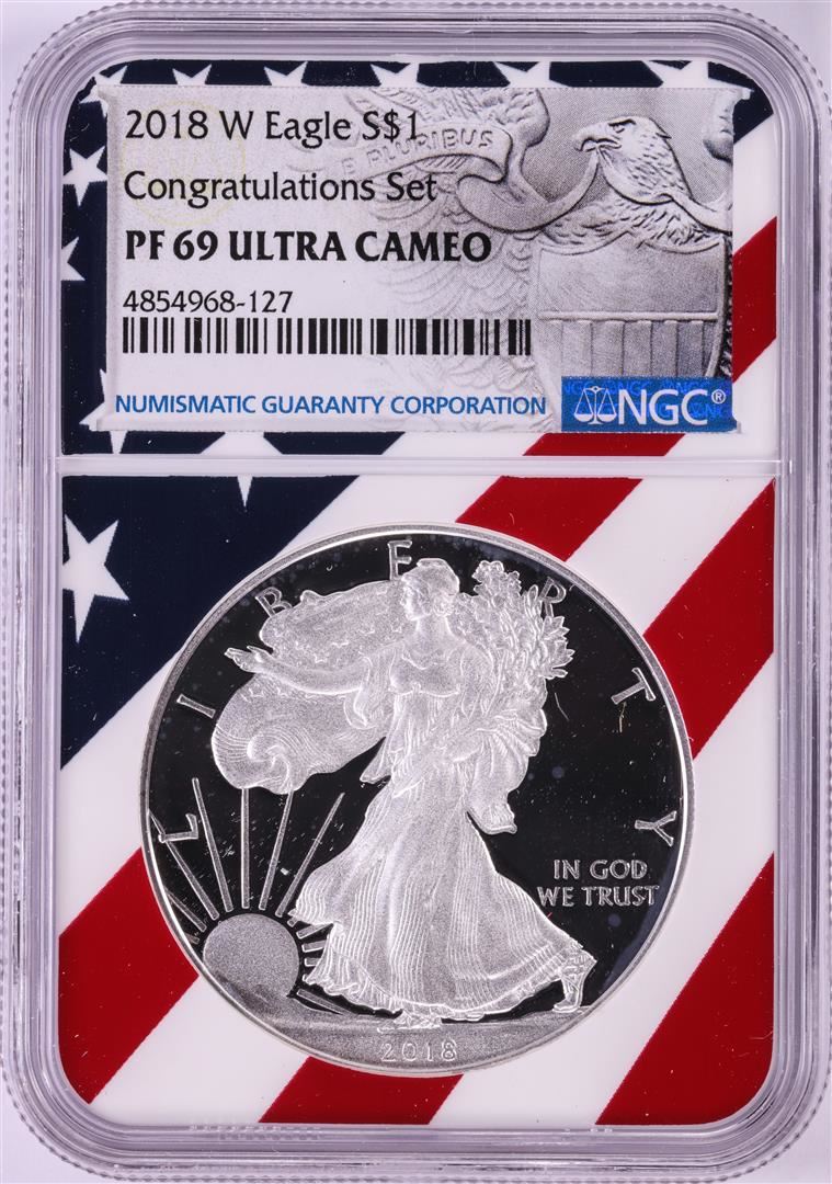2018-W $1 Proof American Silver Eagle Coin NGC PF69 Ultra Cameo Congratulations Flag