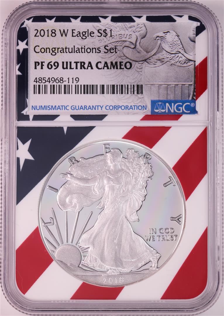 2018-W $1 Proof American Silver Eagle Coin NGC PF69 Ultra Cameo Congratulations Flag
