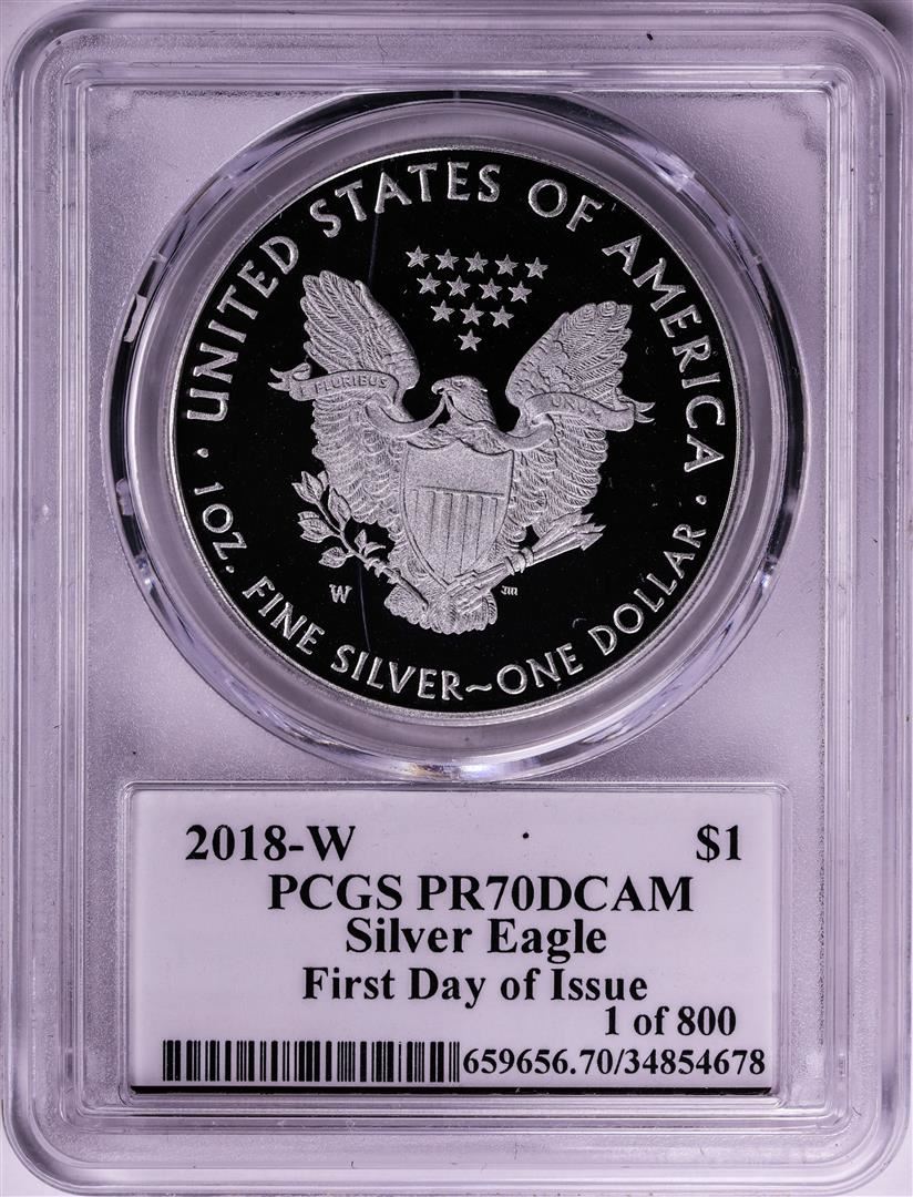 One 2018-W $1 Proof American Silver Eagle Coin PCGS PR70DCAM FDOI Mercanti Signature. PCGS Graded.