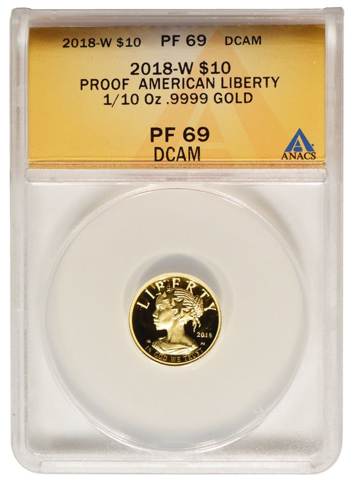 One 2018-W $10 Proof American Liberty Gold Coin ANACS PF69DCAM.