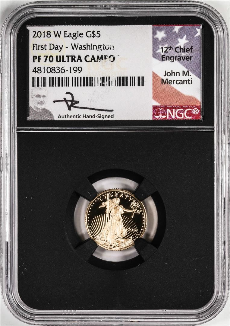One 2018-W $5 Proof American Gold Eagle Coin NGC PF70 Ultra Cameo First Day Mercanti Signed. NGC Certified.