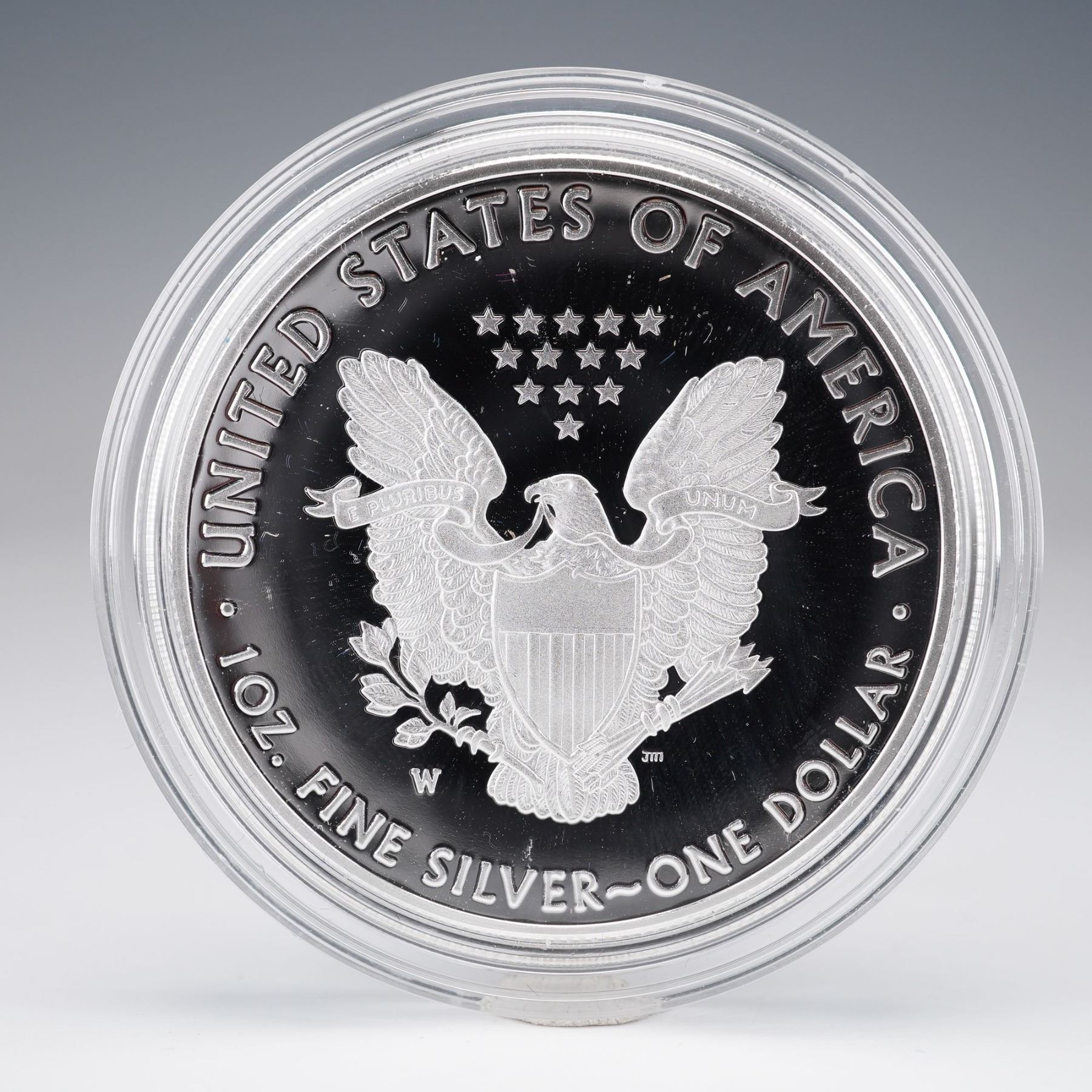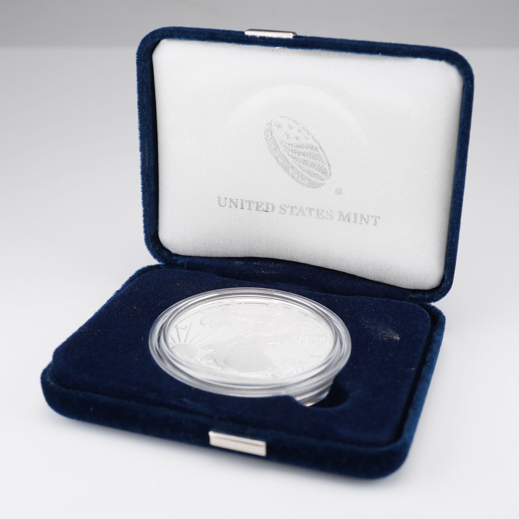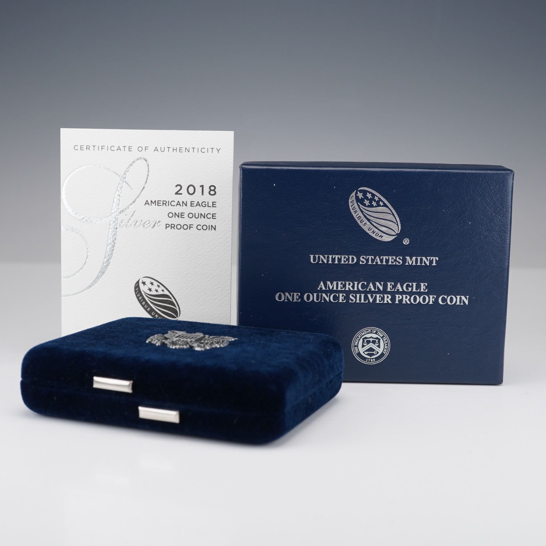 Proof Coin struck by the United States Mint presented in its original blue velvet display case with outer box and Certificate of Authenticity. The obverse features Adolph A. Weinman's Walking Liberty design with inscriptions LIBERTY, IN GOD WE TRUST, and the year 2018. The reverse, by John Mercanti, depicts a heraldic eagle with shield, clutching an olive branch and arrows, surrounded by thirteen stars, with inscriptions UNITED STATES OF AMERICA, 1 OZ. FINE SILVER - ONE DOLLAR, E PLURIBUS UNUM. Net silver weight 0.999 troy oz.