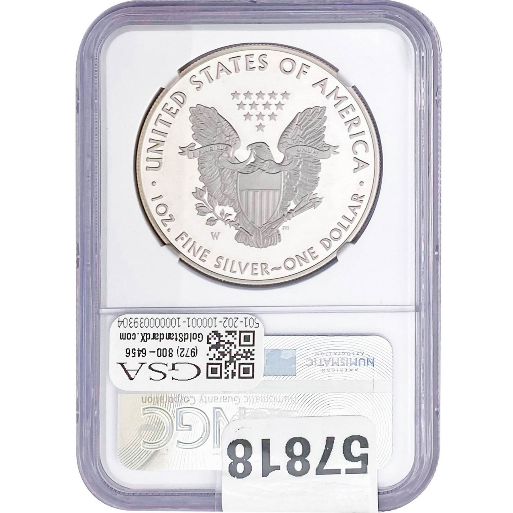 e. Coins sold referencing a third-party grading service are sold “AS IS” without any express or implied warranty, except for a guarantee by GSA that they are genuine. Removal or alteration of the holder, voids all of Bidder’s claims concerning that Product. Certain warranties may be available from the grading services and Bidders are referred to them for further details: Numismatic Guaranty Corporation (NGC), PO Box 4776, Sarasota, FL 34230, www.ngccoin.com/services/writtenguarantee.asp; Professional Coin Grading Services (PCGS), PO Box 9458, Newport Beach, CA 92658, www.pcgs.com/guarantee.html; ANACS, 6555 S. Kenton St., Ste. 303, Englewood, CO 80111; and Independent Coin Grading Co. (ICG), 7901 East Bellview, Ave., Suite 50, Englewood, CO 80111.