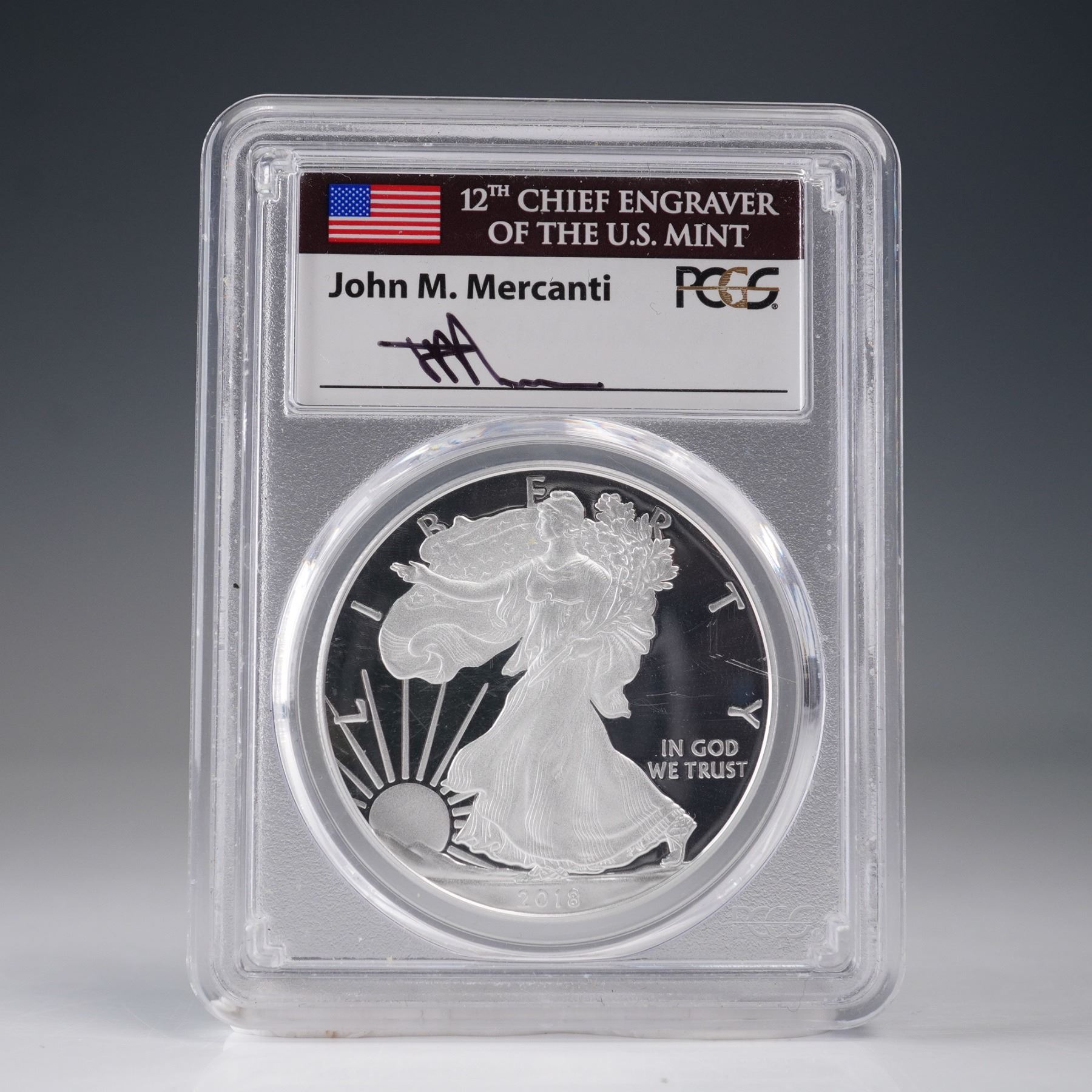 2018-W American Silver Eagle Type 1 Dollar struck at the West Point Mint. This 1-ounce .999 fine silver proof coin is graded PR70 Deep Cameo (DCAM) by PCGS and bears the First Day of Issue designation. The encapsulated label includes the signature of John M. Mercanti, 12th Chief Engraver of the United States Mint, who served from 2006 to 2010. The obverse design features Liberty in full stride, enveloped in the folds of the flag, with her right hand extended and branches of laurel and oak in her left, symbolizing strength and honor. This imagery was originally created by Adolph A. Weinman for the Walking Liberty Half Dollar. The obverse includes the inscriptions "LIBERTY," "IN GOD WE TRUST," and the date "2018." The reverse, designed by John M. Mercanti, displays a heraldic eagle with a shield, clutching an olive branch in the right talon and arrows in the left, representing the United States' commitment to peace and readiness for defense. Above the eagle are thirteen five-pointed stars arranged in a triangle, representing the original thirteen colonies. The inscriptions include "UNITED STATES OF AMERICA," "1 OZ. FINE SILVER - ONE DOLLAR," and the "W" mint mark denoting the West Point Mint. Certified and sealed in a tamper-evident PCGS holder with barcode and serial number verification. This coin is an officially recognized First Day of Issue release. Slab: 2.5"L x 0.25"W x 3.25"H. Coin diameter: 39mm.
