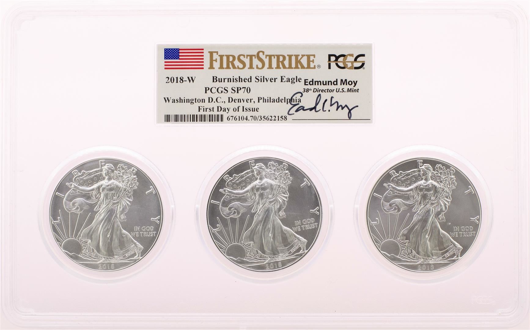 2018-W Burnished Silver Eagle Location Set PCGS SP70 First Strike Edmund Moy Signature