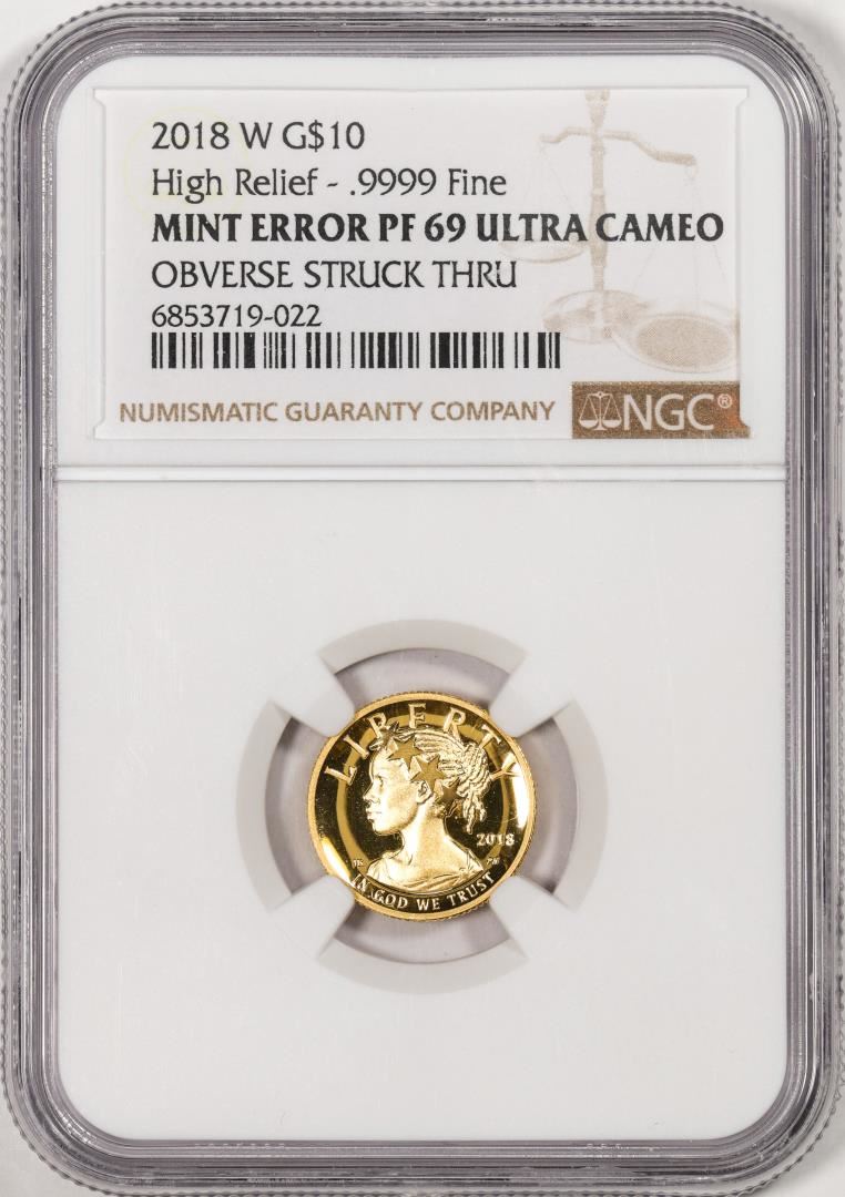 One 2018-W HR $10 American Liberty Gold Coin NGC Mint Error PF69 Ultra Cameo OBV Struck Thru. NGC Certified.