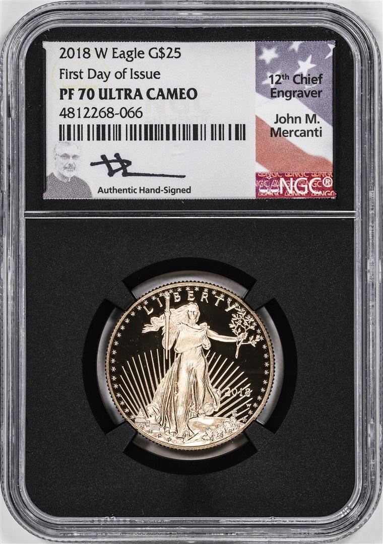 One 2018-W Proof $25 American Gold Eagle Coin NGC PF70 Ultra Cameo Mercanti Signed FDOI. NGC Certified.