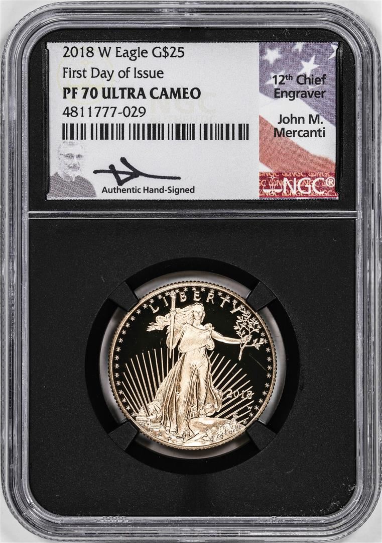 One 2018-W Proof $25 American Gold Eagle Coin NGC PF70 Ultra Cameo Mercanti Signed FDOI. NGC Certified.