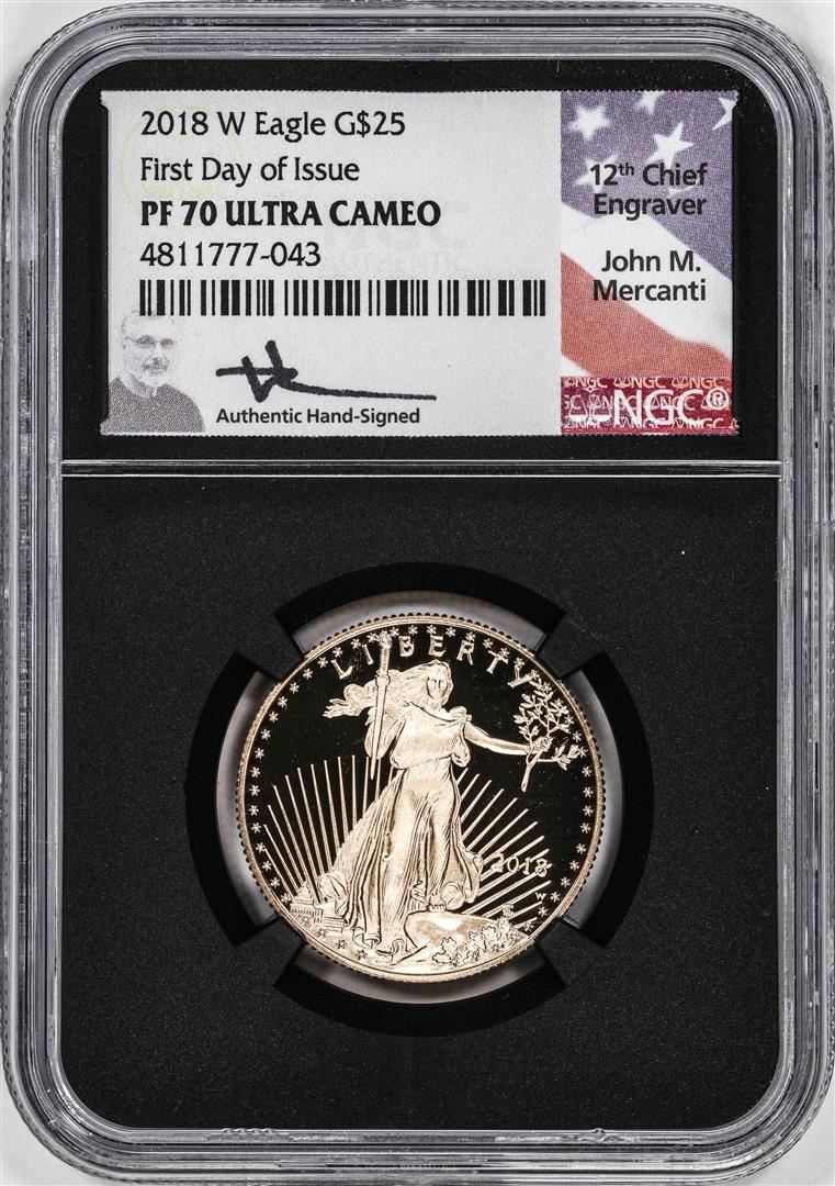 One 2018-W Proof $25 American Gold Eagle Coin NGC PF70 Ultra Cameo Mercanti Signed FDOI. NGC Certified.