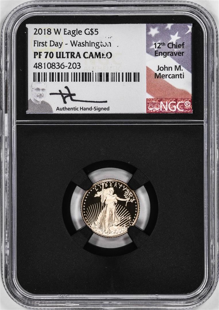 One 2018-W Proof $5 American Gold Eagle Coin NGC PF70 Ultra Cameo Mercanti Signed FD. NGC Certified.