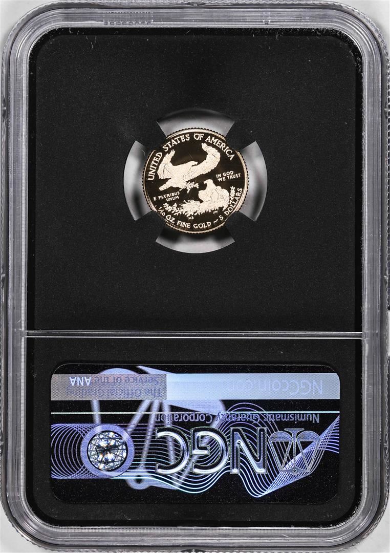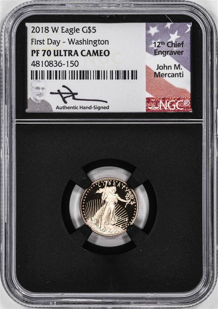 One 2018-W Proof $5 American Gold Eagle Coin NGC PF70 Ultra Cameo Mercanti Signed FD. NGC Certified.