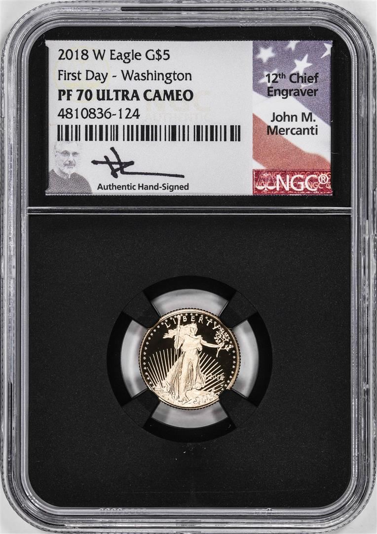 One 2018-W Proof $5 American Gold Eagle Coin NGC PF70 Ultra Cameo Mercanti Signed FD. NGC Certified.