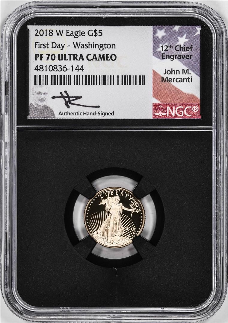 One 2018-W Proof $5 American Gold Eagle Coin NGC PF70 Ultra Cameo Mercanti Signed FD. NGC Certified.