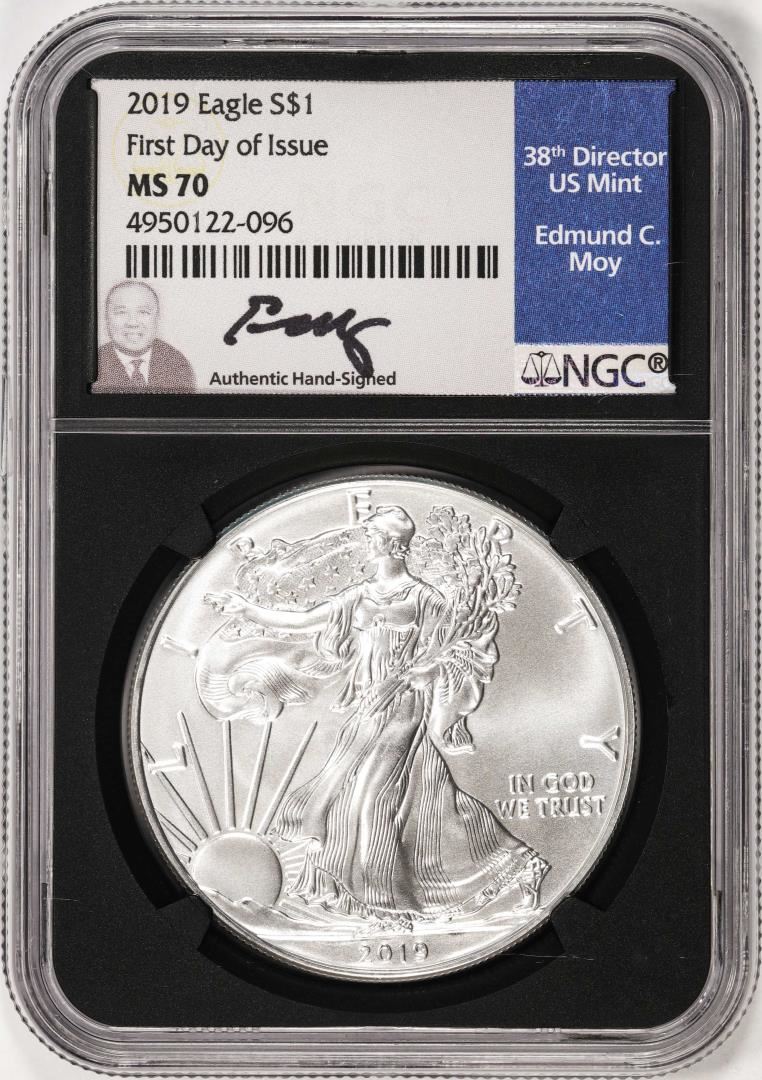 2019 $1 American Silver Eagle Coin NGC MS70 First Day of Issue Edmund Moy Signature