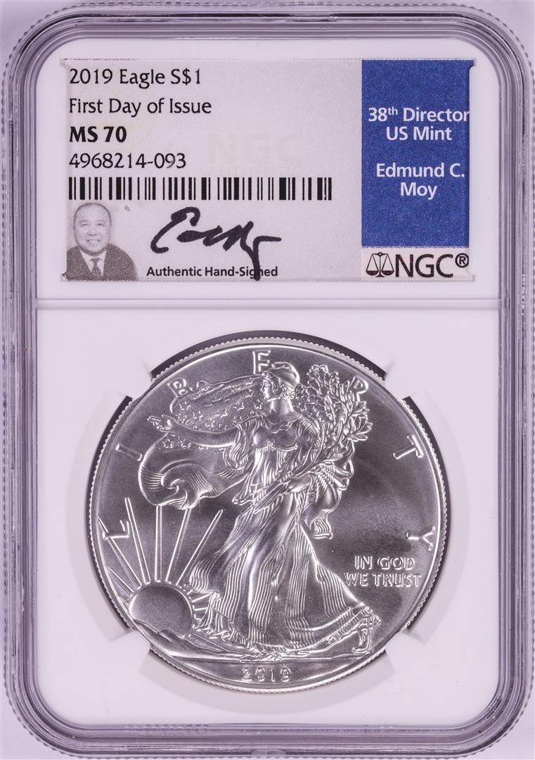 2019 $1 American Silver Eagle Coin NGC MS70 W/Edmund C. Moy Signature First Day of Issue