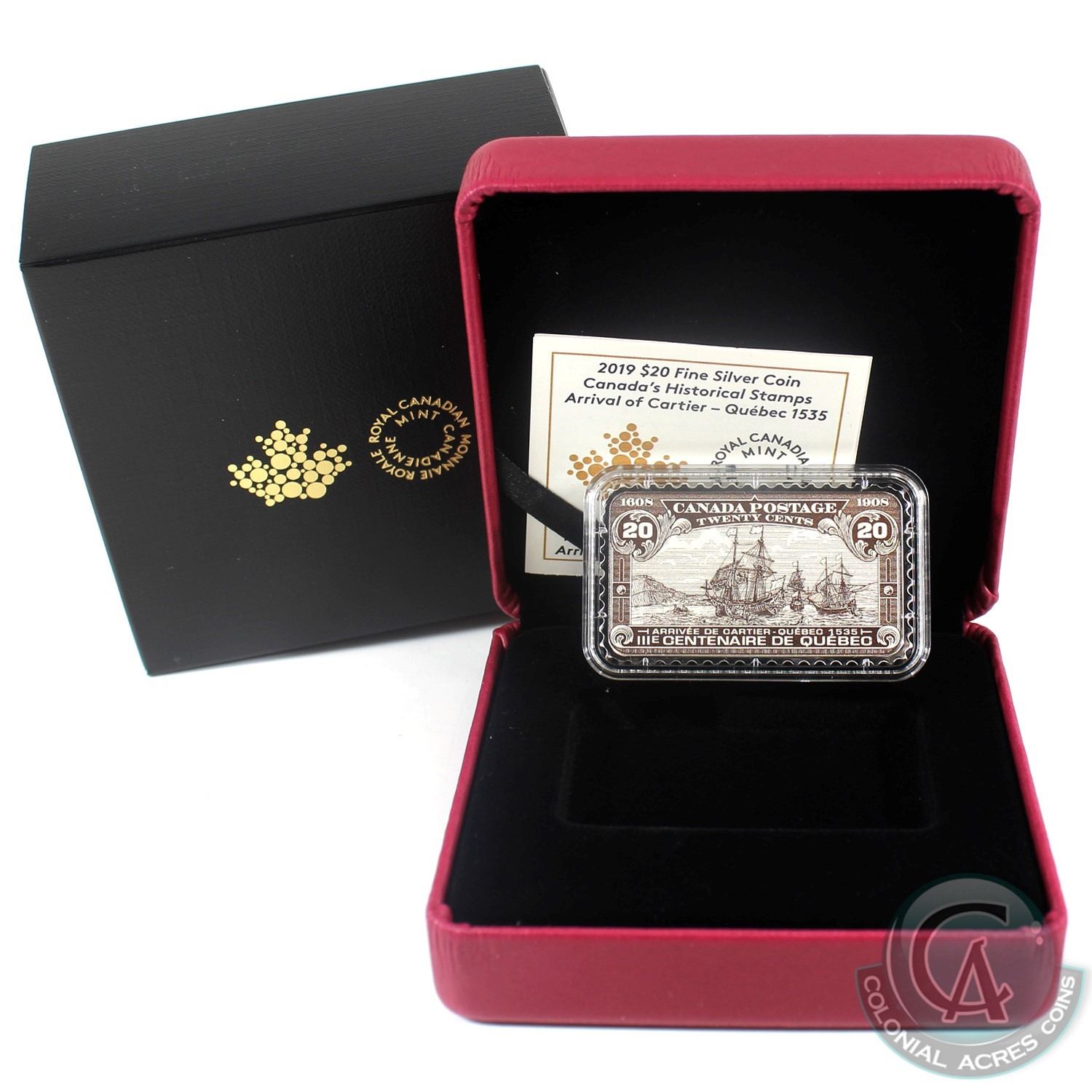 2019 $20 Canada's Historical Stamps: Arrival of Cartier - Quebec 1535 Fine Silver. (TAX Exempt)