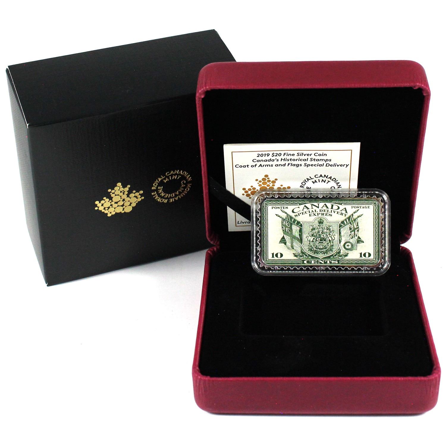 2019 $20 Canada's Historical Stamps - Coat of Arms & Flags Special Delivery Fine Silver Coin. (TAX Exempt)