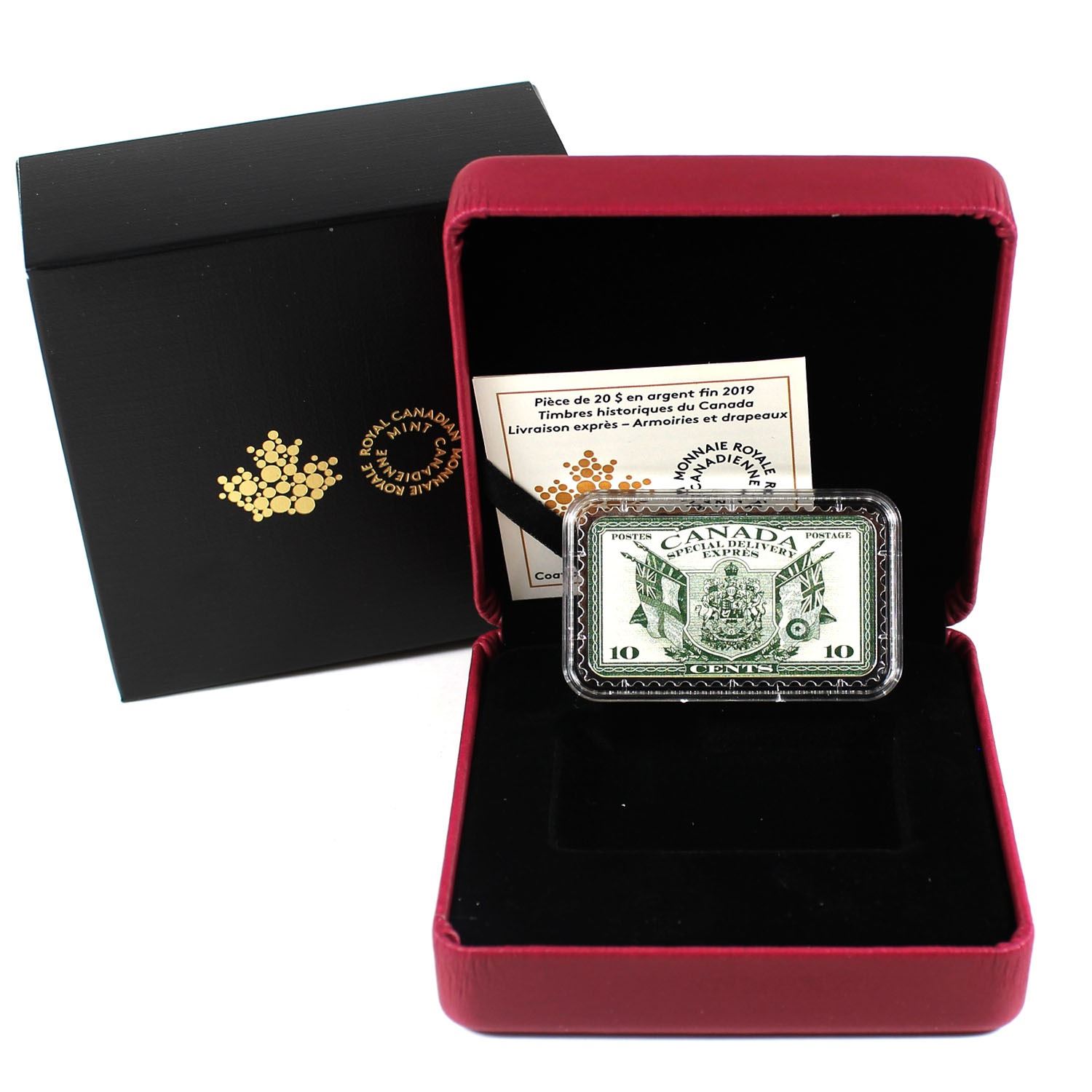 2019 $20 Canada's Historical Stamps Coat of Arms & Flags Special Delivery Fine Silver (TAX Exempt).