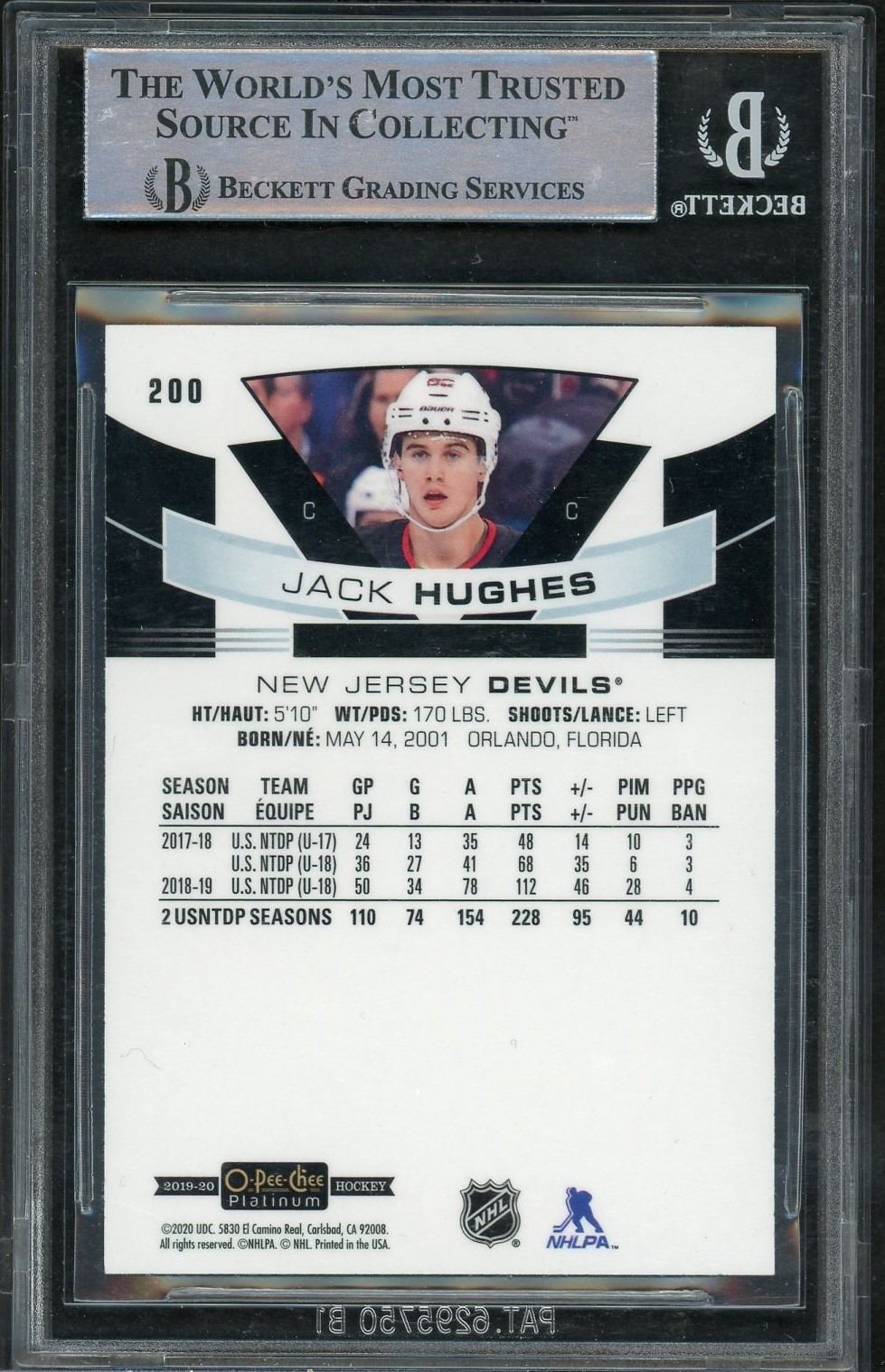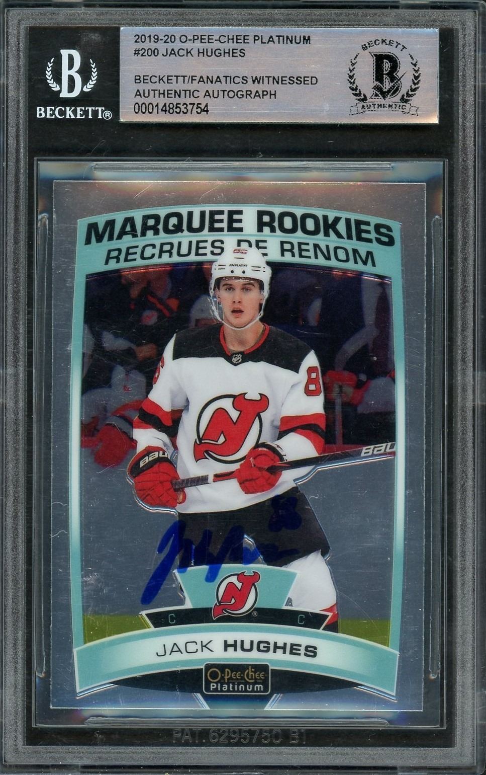 2019-20 OPC Platinum on card rookie autograph of star Devils forward Jack Hughes Authenticated by BGS as an in person signing.