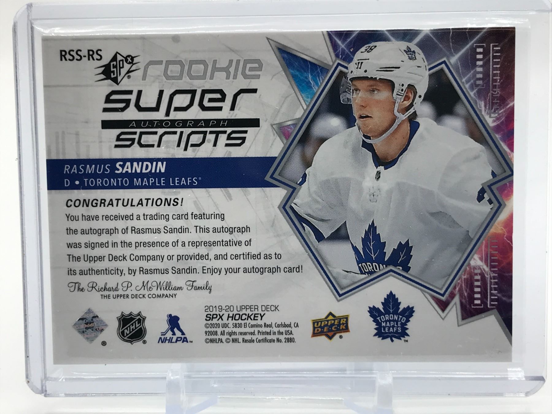 2019-20 UPPER DECK SPX HOCKEY RASMUS SANDIN SIGNED TRADING CARD