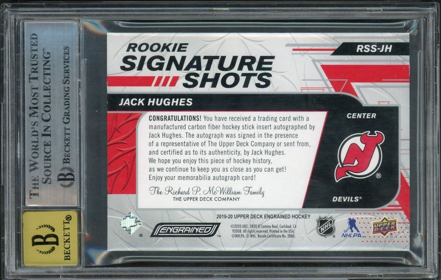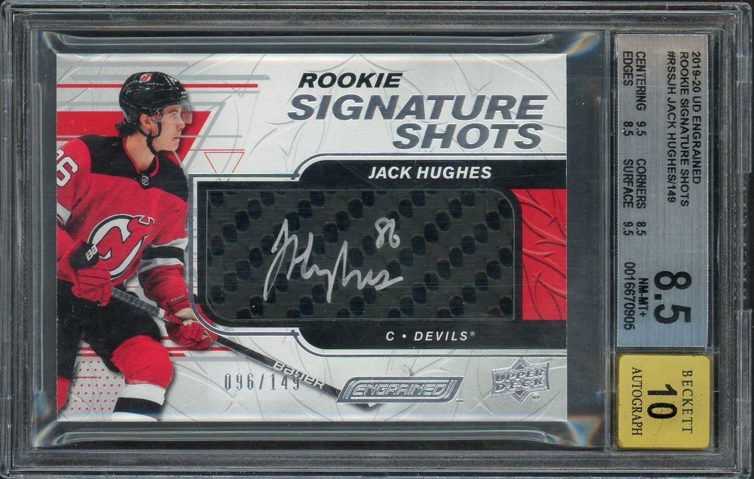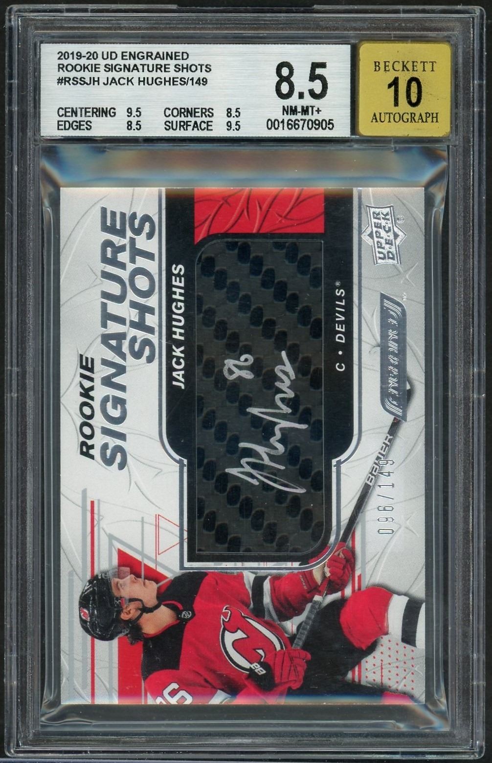 2019-20 UD Engrained rookie signature shots autograph #96/149 of New Jersey Devils star forward Jack Hughes grad a NM-MT+ 8.5 with a 10 auto by BGS.