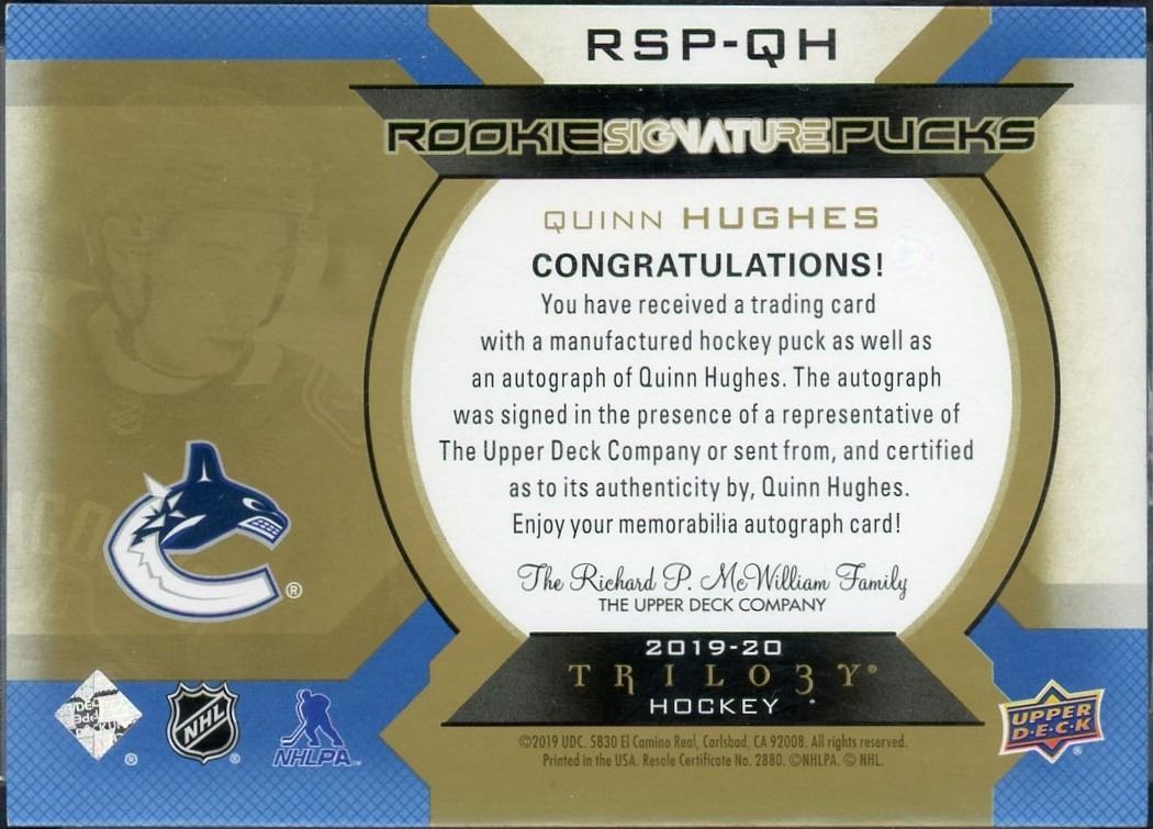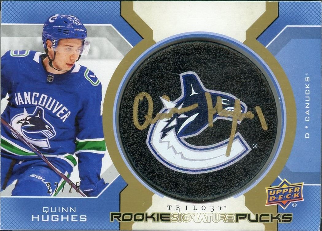2019-20 UD Trilogy rookie signature pucks autograph #'d to 25 of allstar Canucks captain and arguably top defenseman in the league Quinn Hughes!