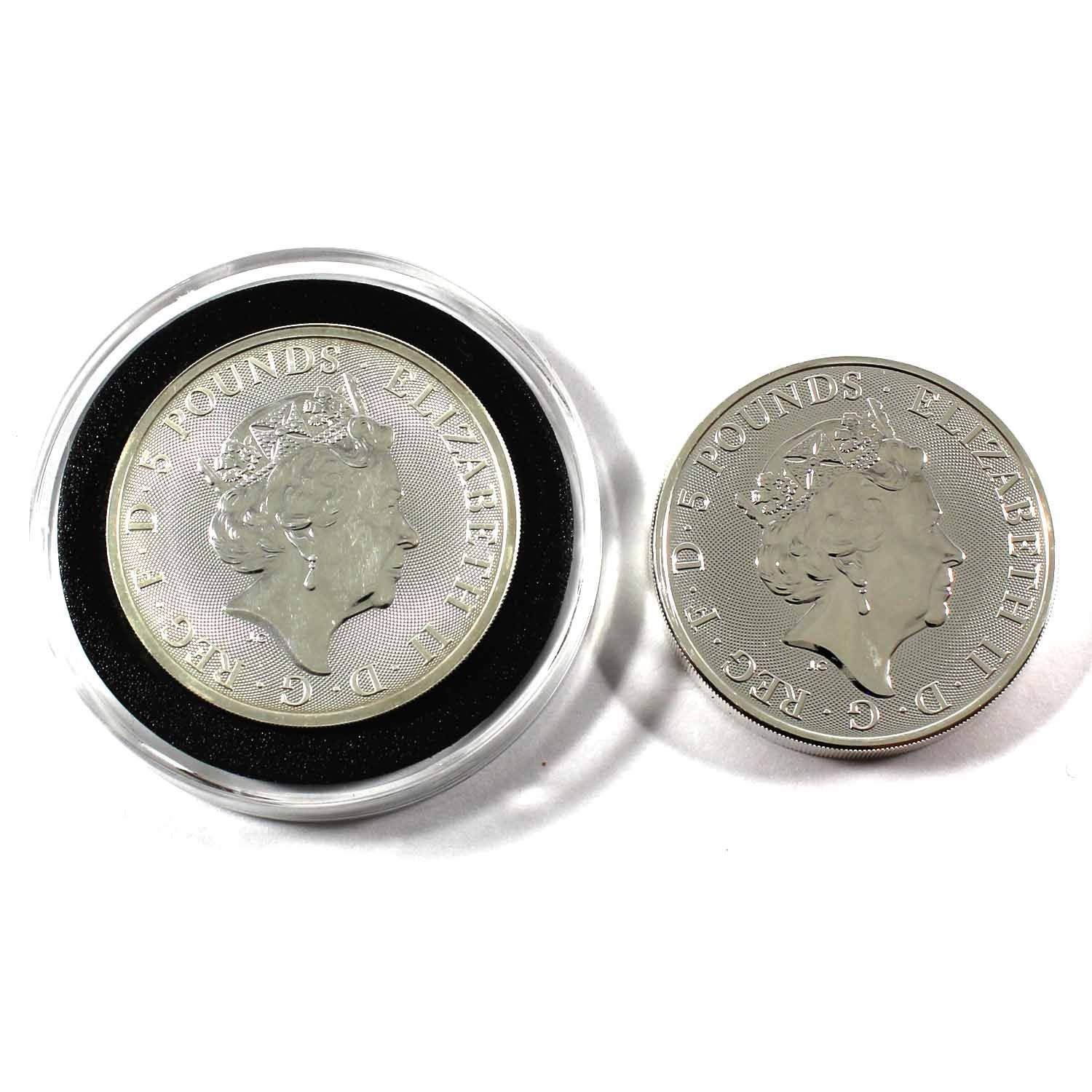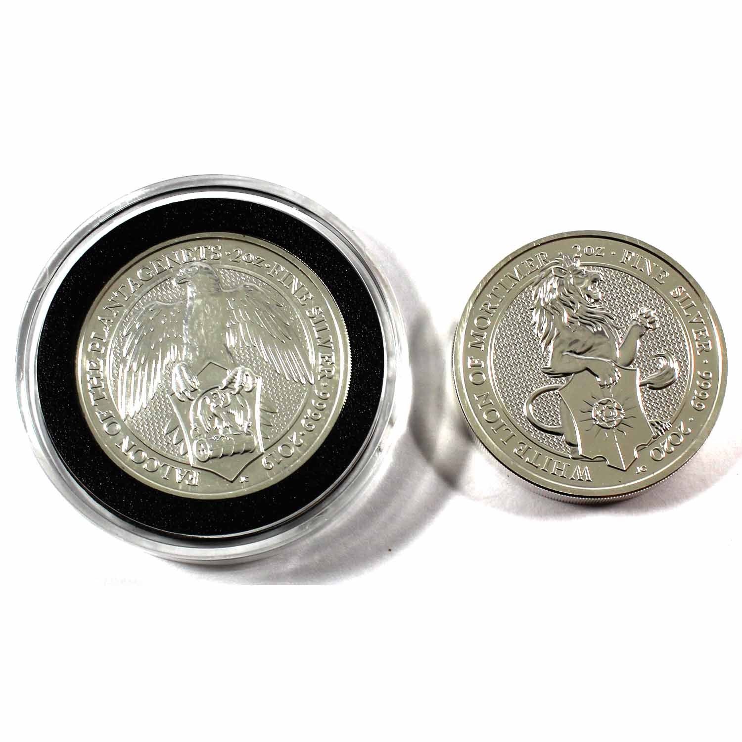 2019 & 2020 Great Britain 5 Pounds Queen's Beasts 2oz .9999 Fine Silver Coins - 2019 The Falcon of the Plantagenets & 2020 White Lion of Mortimer (2019 is toned). 2pcs (TAX Exempt)