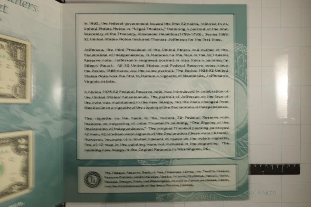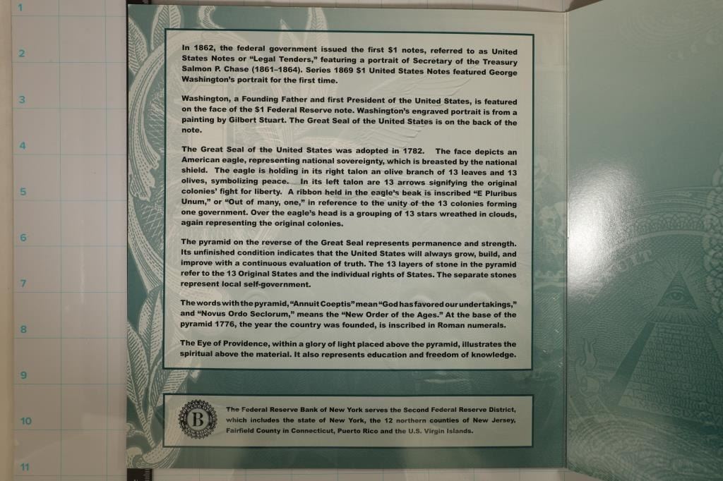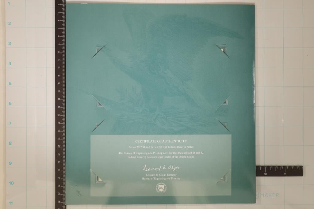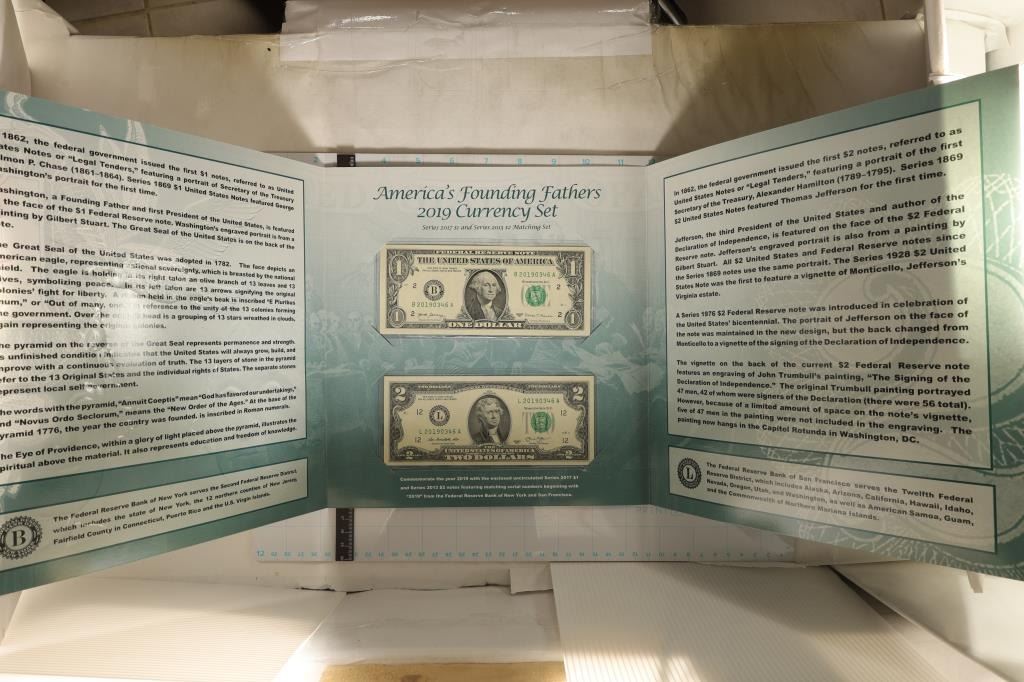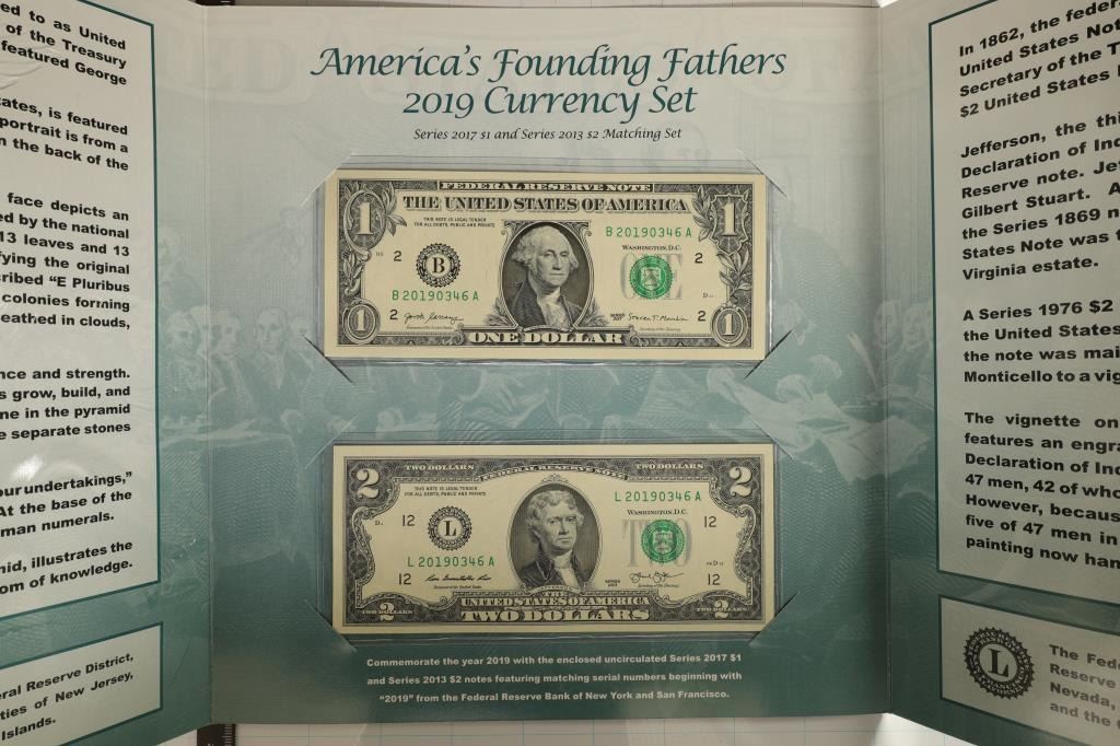 CONTAINS: 2017 CRISP UNC US $1 BILL WITH SERIAL NUMBER 20190346A AND 2013 CRISP UNC US $2 BILL WITH MATCHING SERIAL NUMBER 20190346A. BOTH BILLS HAVE THE SAME SERIAL NUMBER. BY THE BUREAU OF ENGRAVING AND