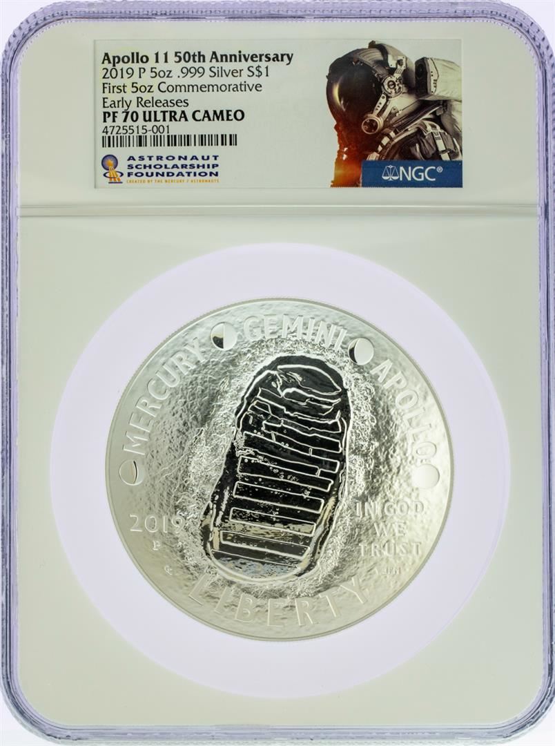 One 2019 Apollo 5 Ounce Commemorative Silver Coin NGC PF70 Early Releases. NGC Certified.