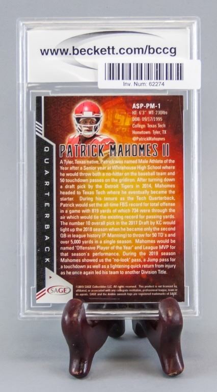 2019 BCCG Sage Aspire sports card. Featuring Patrick Mahomes II. Player information on reverse.