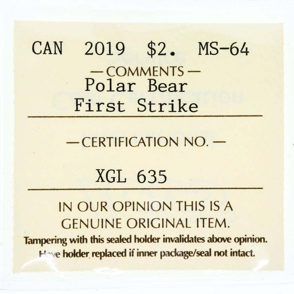 2019 Canada $2 Polar Bear First Strike MS 64 ICCS