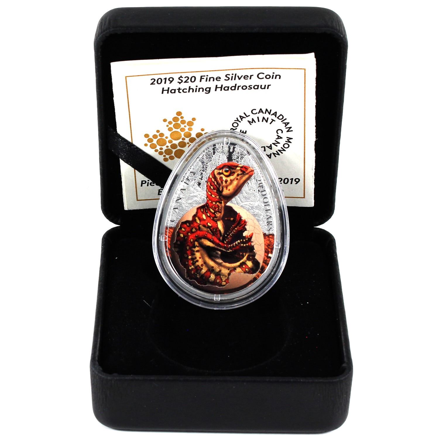 2019 Canada $20 Hatching Hadrosaur Fine Silver Coin (No Tax). This quickly sold out coin is prized among many collectors! The Royal Canadian Mint seldom uses their egg shape for coins. Comes with encapsulated coin, COA, and black clamshell case.