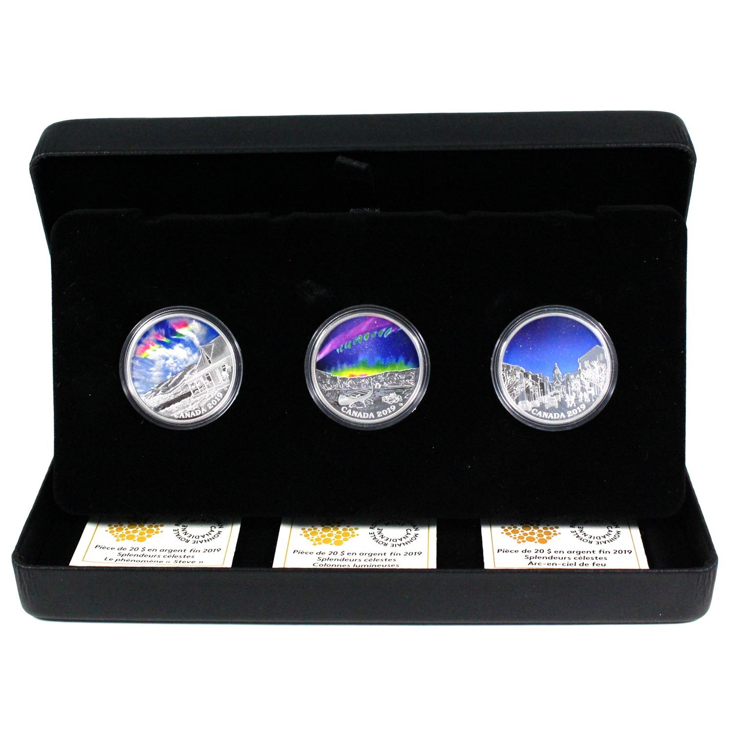 2019 Canada $20 Sky Wonders Subscription Full 3-coin Fine Silver Set Featuring Fire Rainbow, "Steve" & Light Pillars with Black Light. (TAX Exempt)