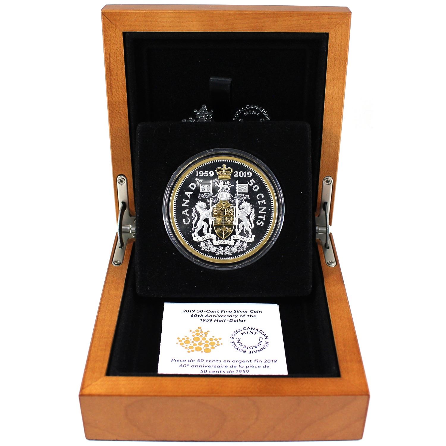 2019 Canada 50-cent 60th Anniversary of the 1959 Half Dollar Fine Silver (No Tax) Comes with encapsulated coin, COA, and deluxe wooden case. Stickers.