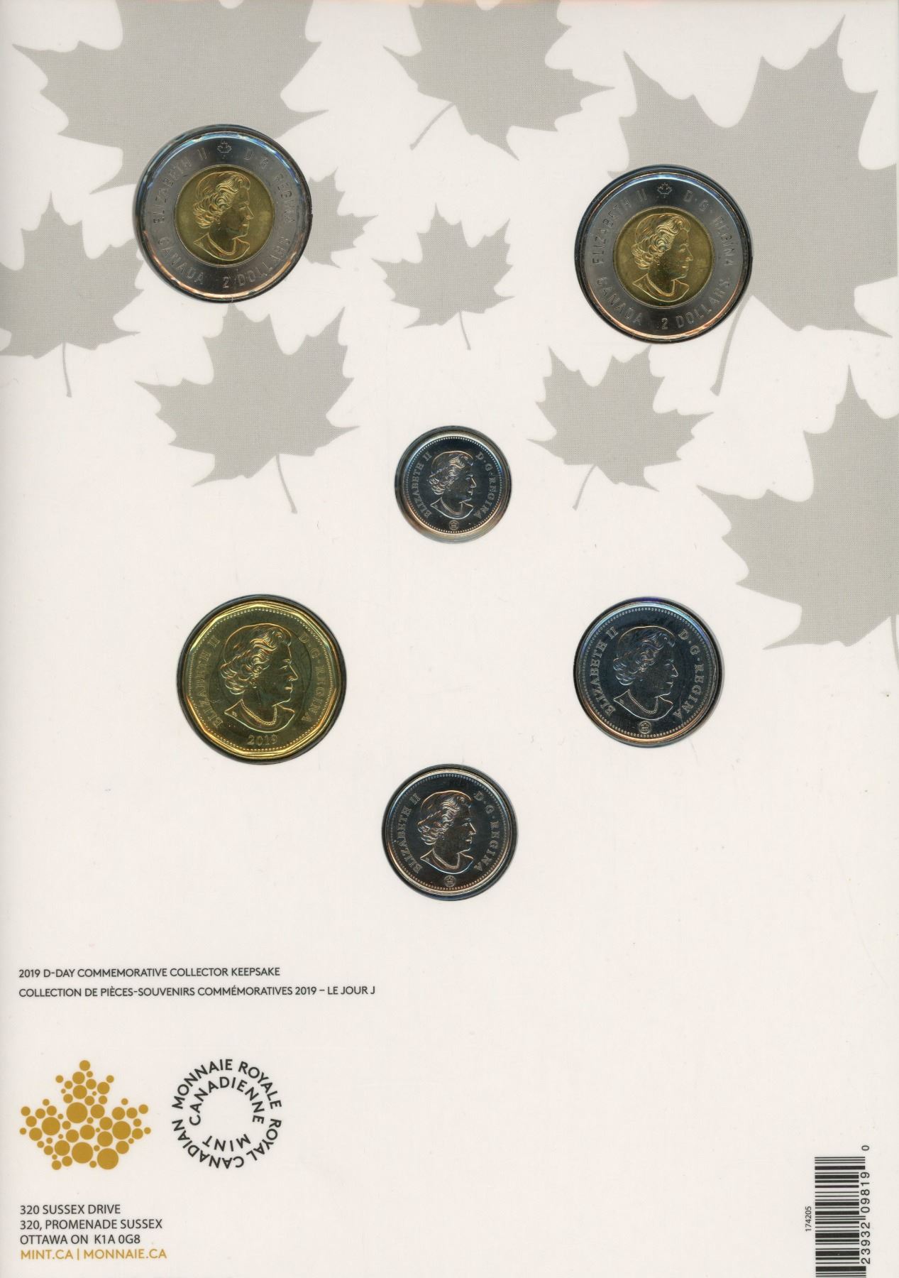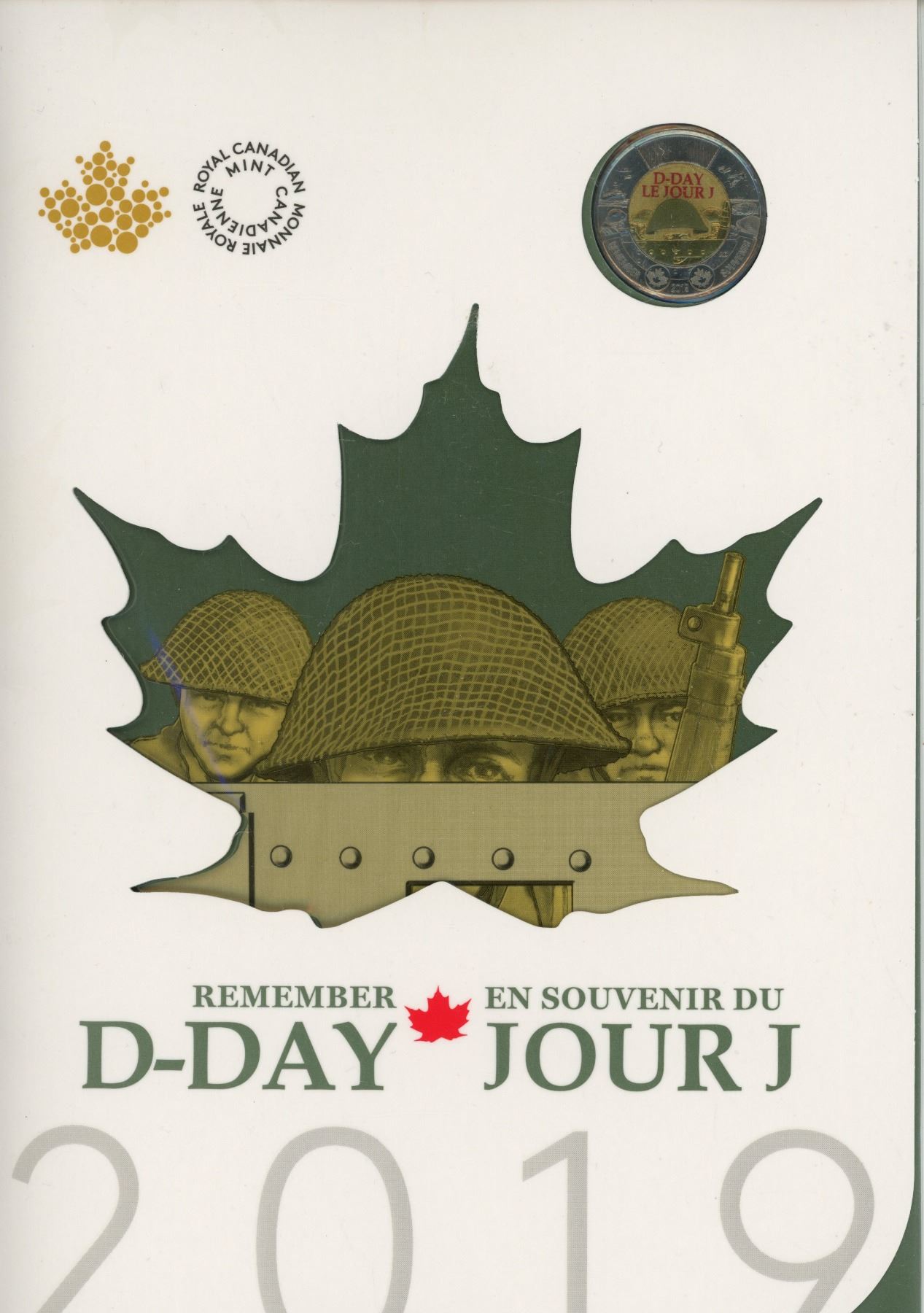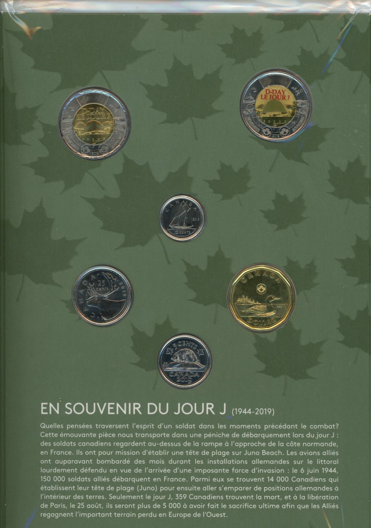 2019 D-Day 6-coin set. Includes 2 Toonies: one regular, the other Colourized. Housed in its original unopened Royal Canadian Mint packaging.