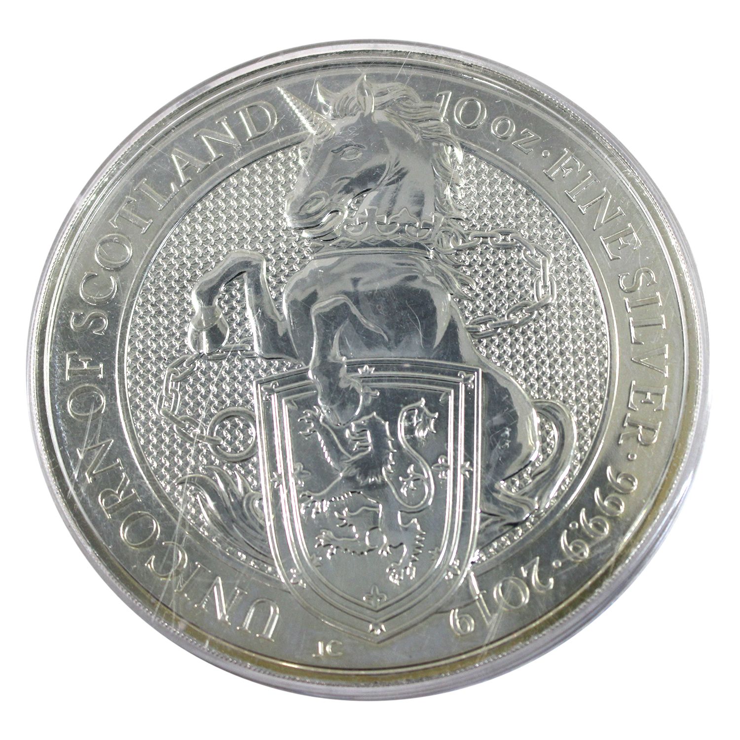 2019 Great Britain 10oz Queen's Beasts - Unicorn of Scotland .9999 Fine Silver Coin (Scratched capsule & coin lightly toned) Tax Exempt