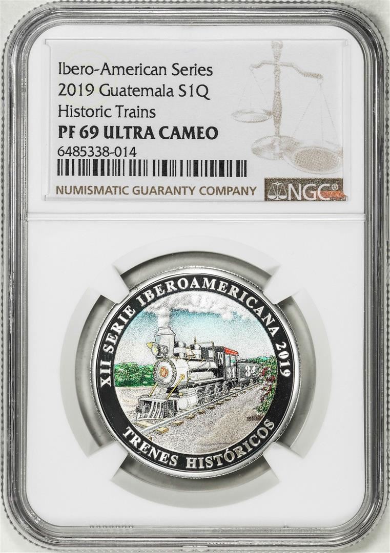 One 2019 Guatemala 1 Quetzal Ibero Historic Trains Proof Silver Coin NGC PF69 Ultra Cameo. NGC Certified.