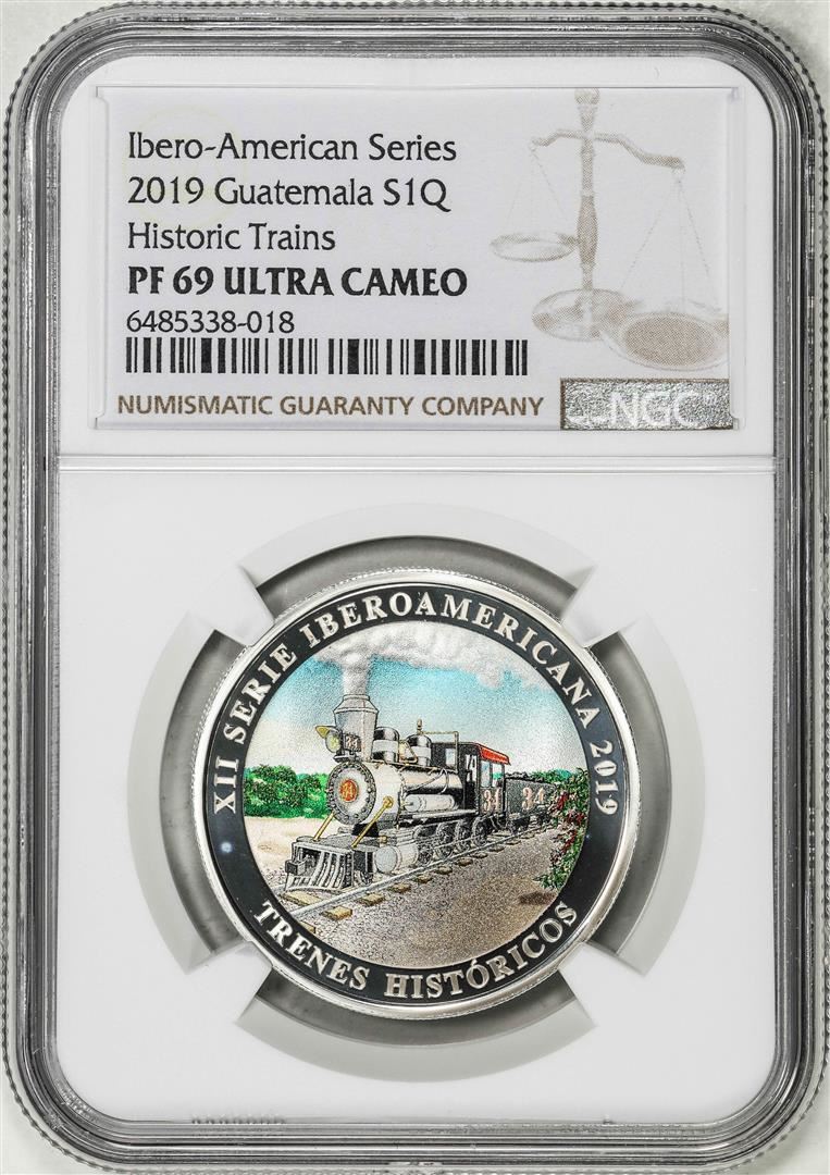 One 2019 Guatemala 1 Quetzal Ibero Historic Trains Proof Silver Coin NGC PF69 Ultra Cameo. NGC Certified.