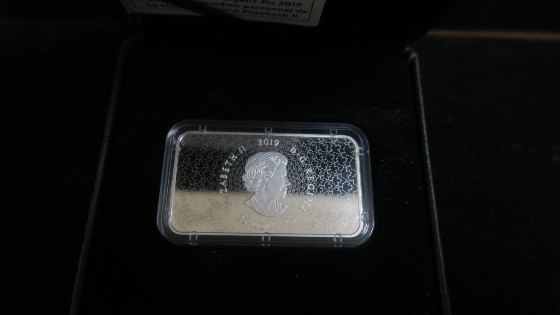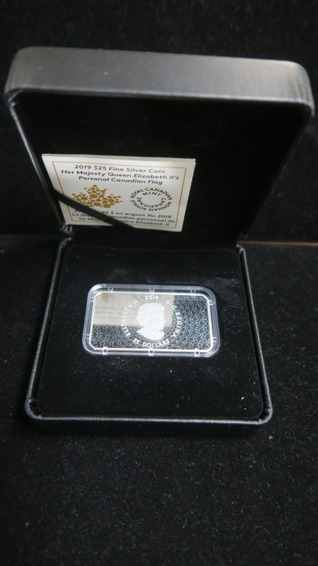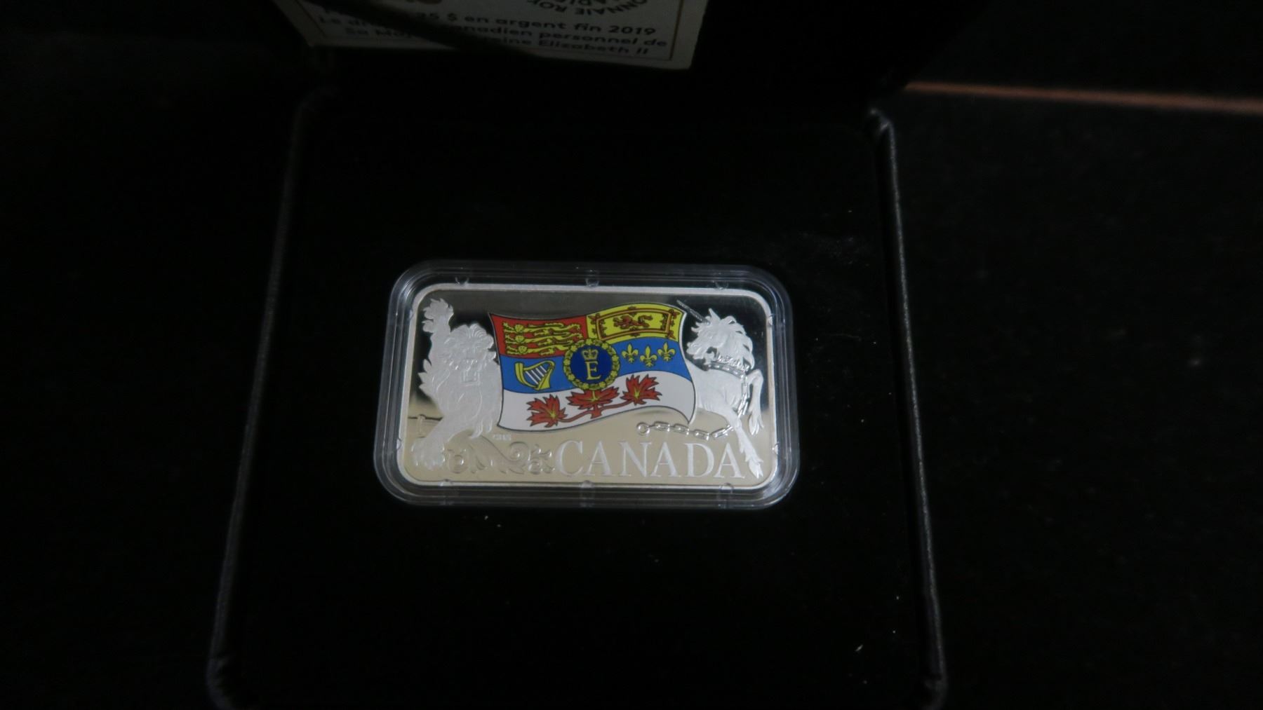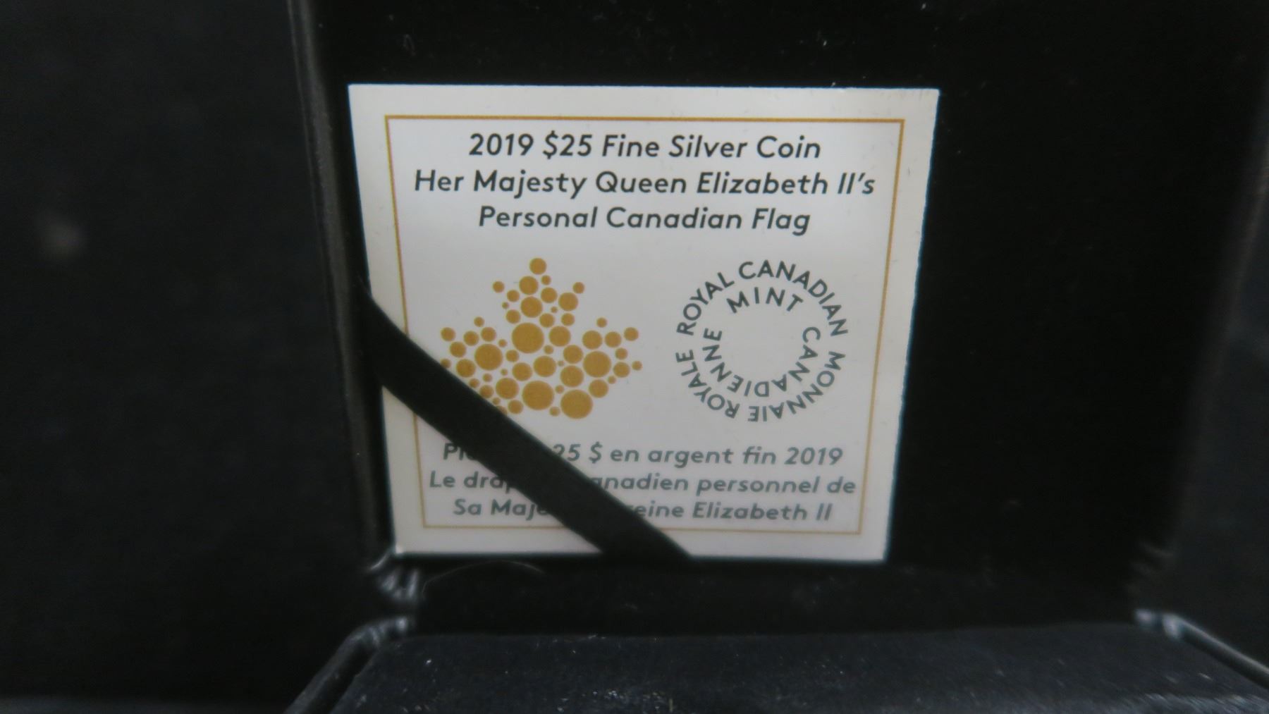 2019 Her Majesty Queen Elizabeth II’s Personal Canadian Flag $25. 99.99% pure Silver. Colourized. Proof with Ultra Heavy Cameo. Mintage of 3,000. Scarce. Housed in its original case & box of issue.